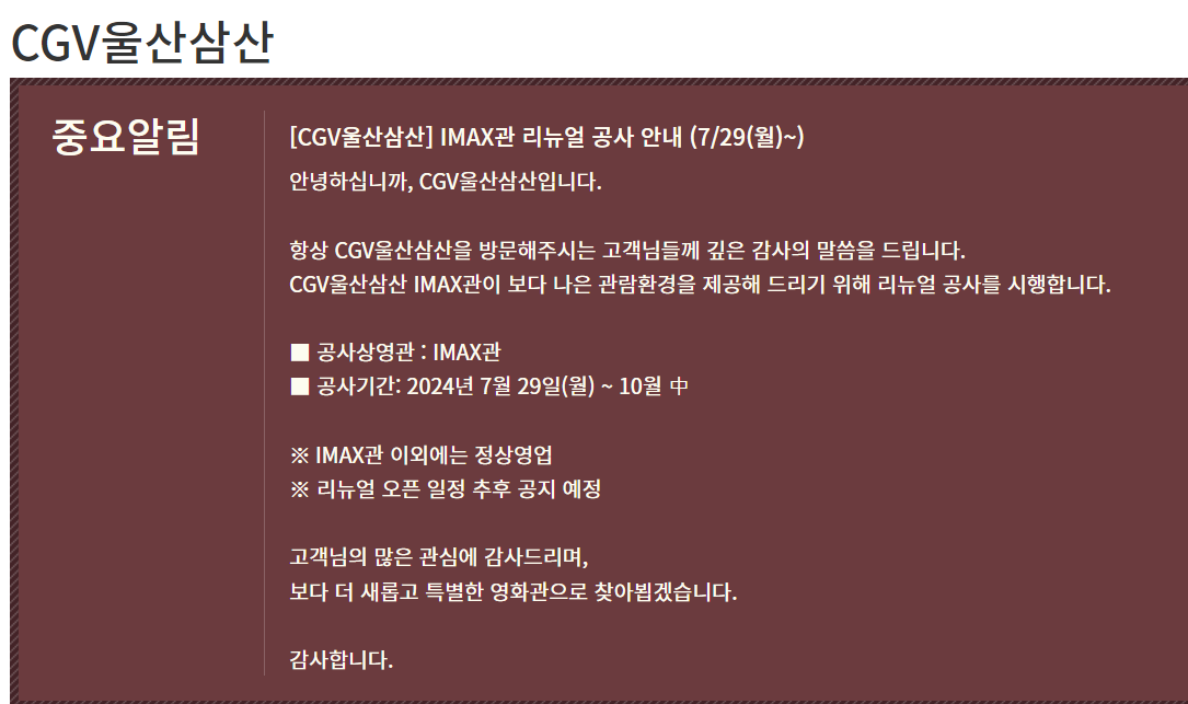 그런데 그 사이에 울산삼산 아이맥스관이 레이저 아이맥스관으로 리뉴얼이 된다는 소식이 확정되었습니다.