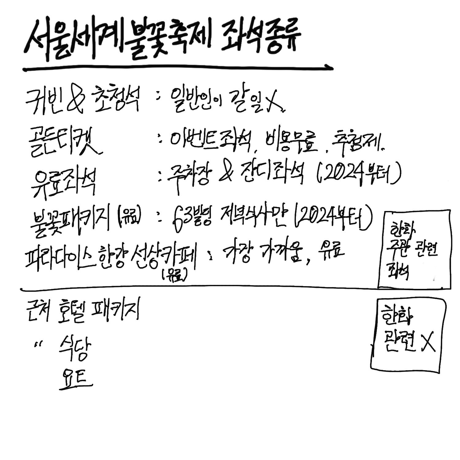 크게 두 종류로 나눠지는데요, 주최사이자 주관사인 한화와 관련된 유료좌석이냐 아니냐로 크게 나눠집니다.
