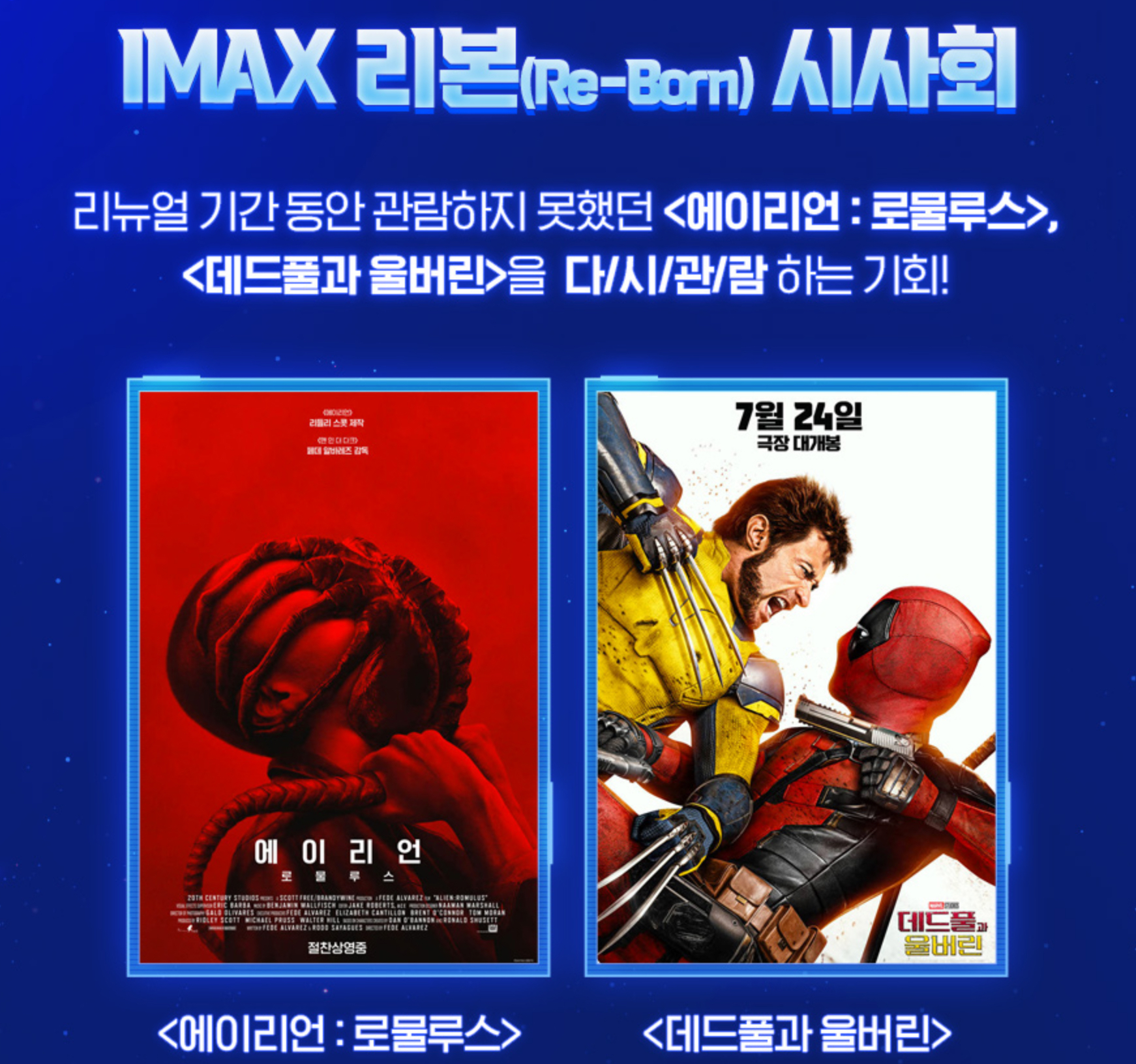 일단 일산 아이맥스관이 리뉴얼 공사를 하면서 상영하지 못했던 '에이리언: 로물루스'와 '데드풀과 울버린'을 9월 27일 재개관일날 리본 시사회라는 이름으로 상영할 예정이라고 합니다. 모두가 예매해서 볼 수 있는 것은 아니고, 9월 20일 금요일부터 9월 23일 월요일까지 응모를 하신 분들 중 9월 25일 추첨에 당첨된 분들에 한해서 관람할 수 있다고 합니다.
