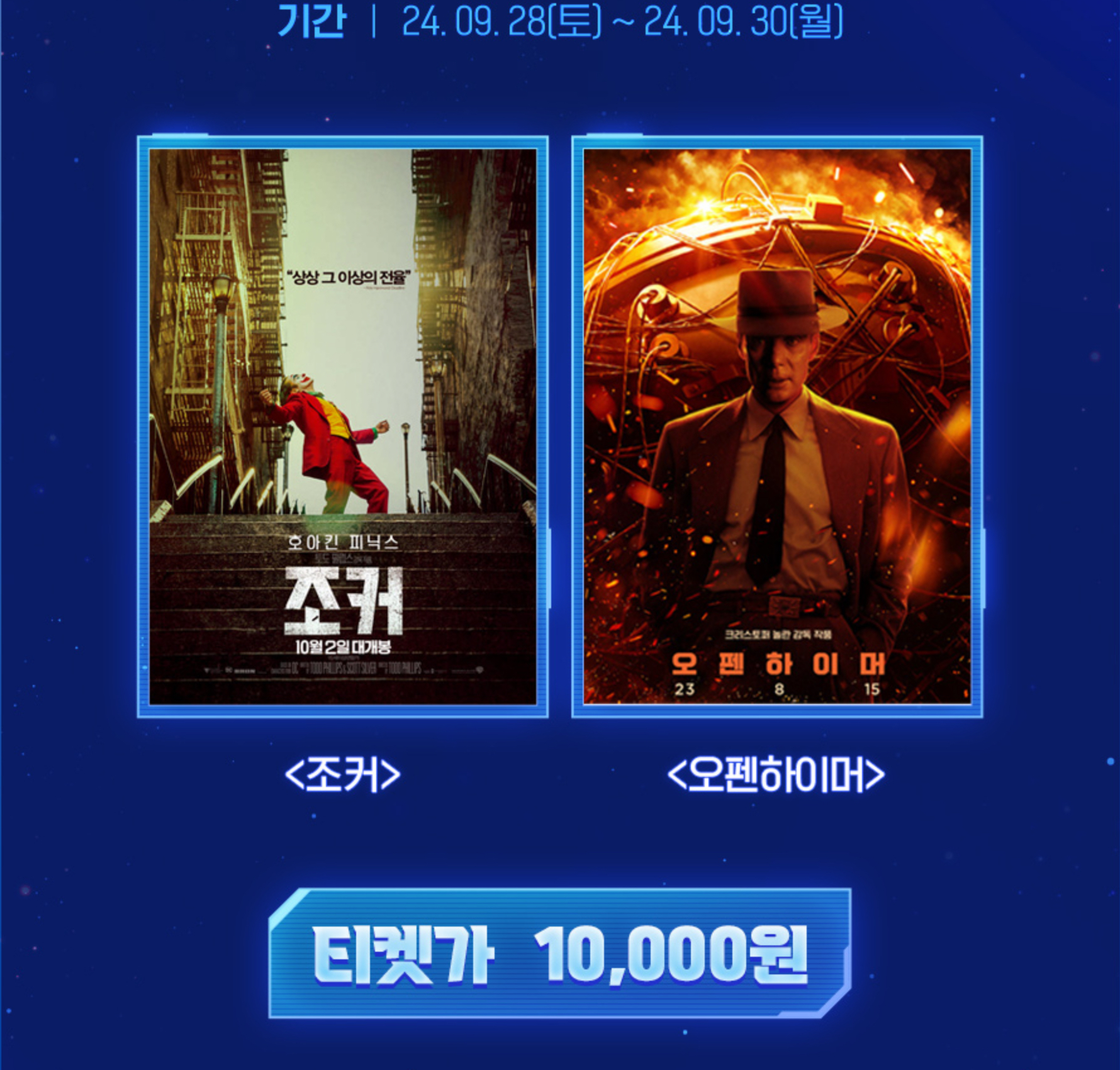 그리고 9월 28일부터 30일까지는 영화 '조커'와 '오펜하이머'를 만원에 관람할 수 있는 특가 이벤트를 진행한다고 합니다.