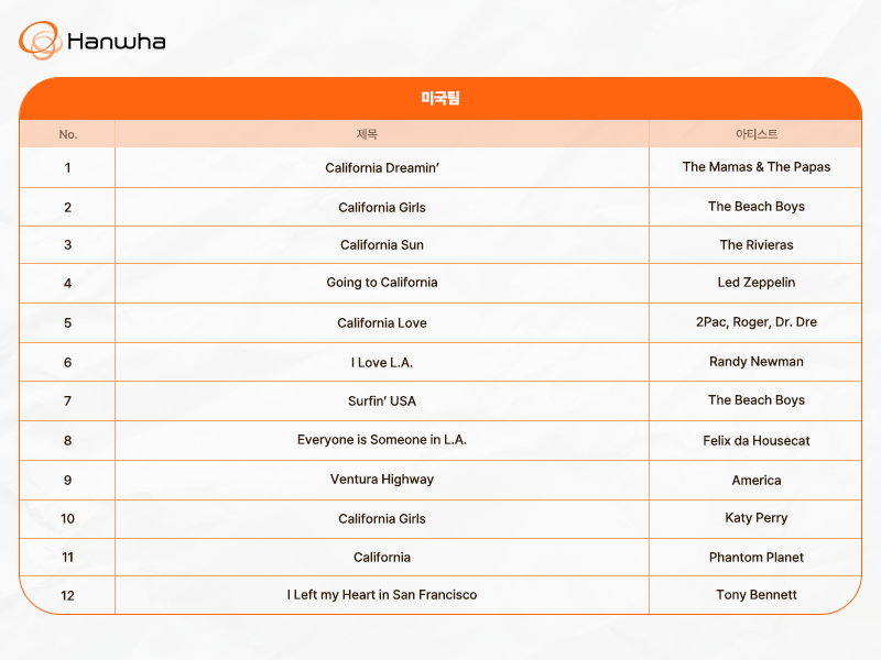 선곡표에서 캘리포니아라는 제목이 들어간 노래가 12곡 중 7개곡일 정도로 캘리포니아에 진심인 모습입니다.