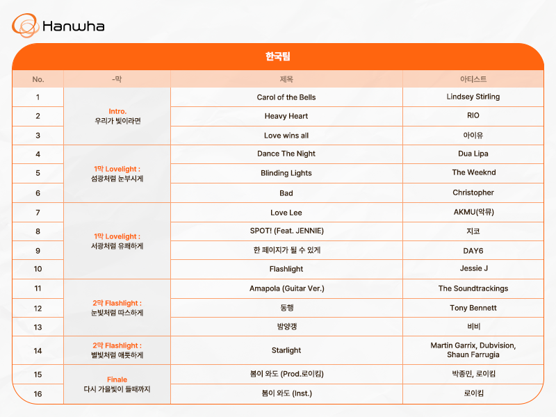 불꽃 연출의 전체적인 스토리라인이자 핵심이라 할 수 있는 선곡표들을 한 번 살펴보겠습니다.