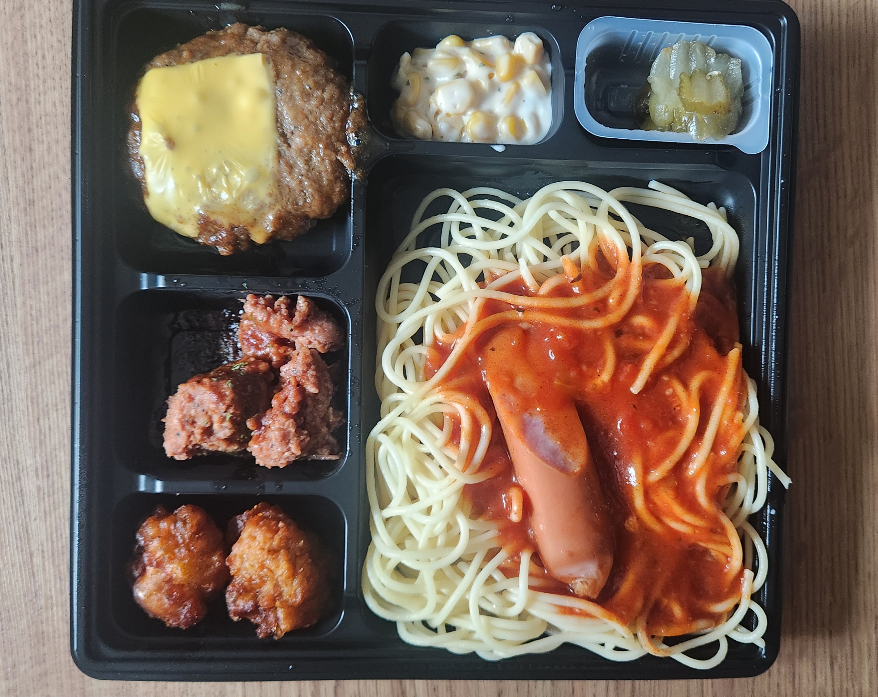 가라아, 제육, 함박스테이크, 콘샐러드, 오이피클을 밑반찬으로 하고 있고 나폴리탄 스파게티처럼 만들어진 스파게티를 주 메뉴로 하고 있습니다. 사실 생각보다 양은 조금 적은 편입니다. 하지만 4900원이란 가격에 이렇게 다양한 반찬 구성을 해냈다는 것은 장점이라 할 수 있겠습니다.
