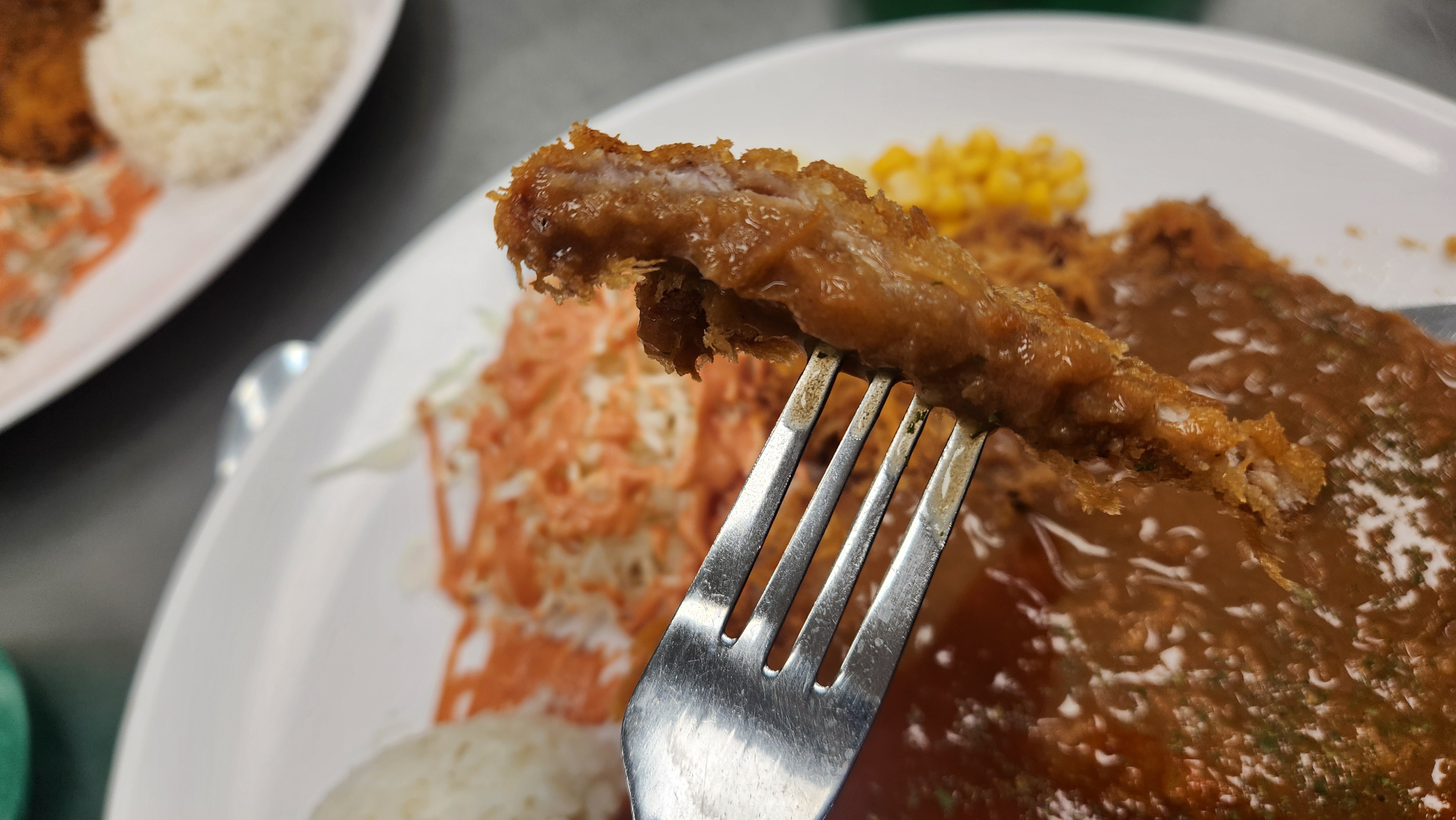 고기의 식감은 일반적인 바삭함에서 크게 벗어나지 않는 느낌이었습니다. 일반 왕돈까스의 소스는 담백한 맛이었습니다. 크게 자극적이거나 단 맛은 아니었습니다. 매운 왕돈까스의 소스는 첫 맛은 그렇게 매콤하지 않았지만 뒷맛에 매콤함이 갑자기 확 올라오는 느낌이었습니다. 매콤함의 강도는 꽤 자극적인 정도였습니다.