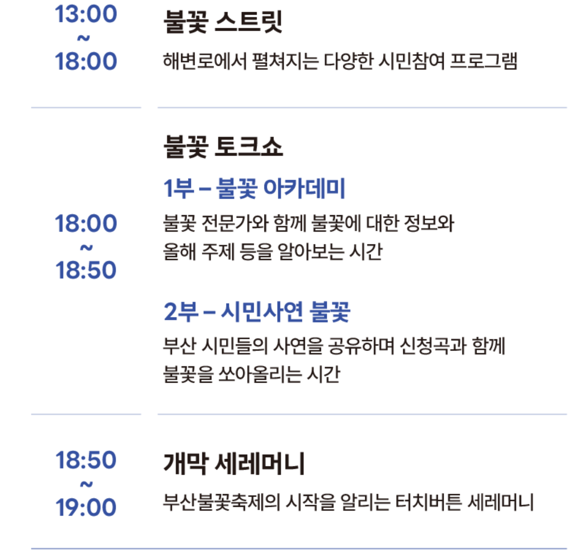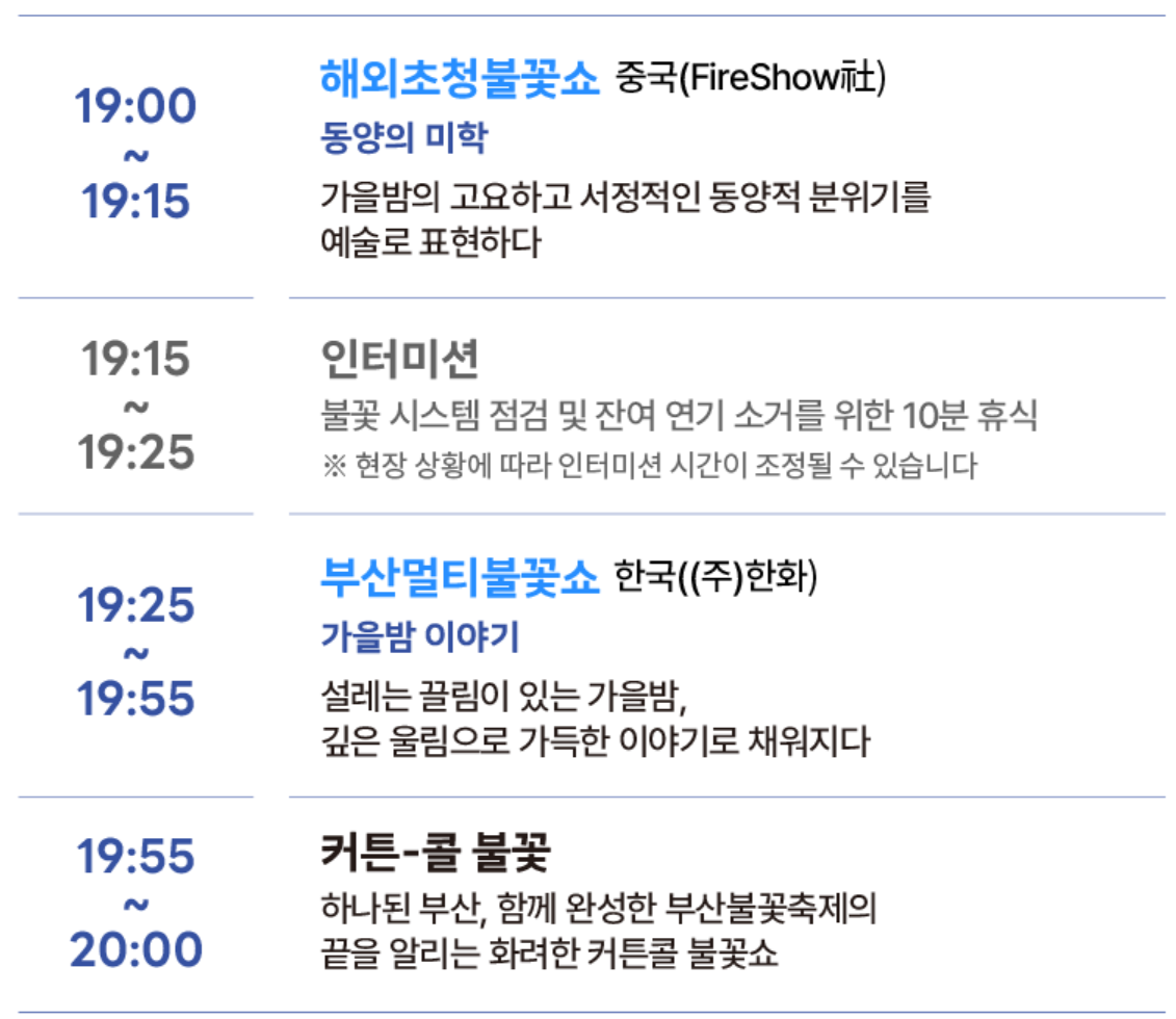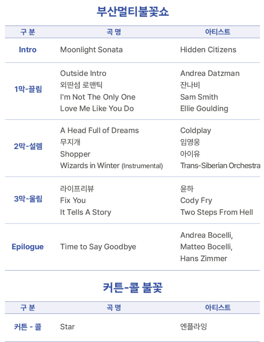 아무튼 이번 부산 불꽃축제는 어떻게 진행이 되는지 그리고 전체적인 불꽃 연출을 결정할 음악 선곡 리스트도 간단하게 살펴보겠습니다.