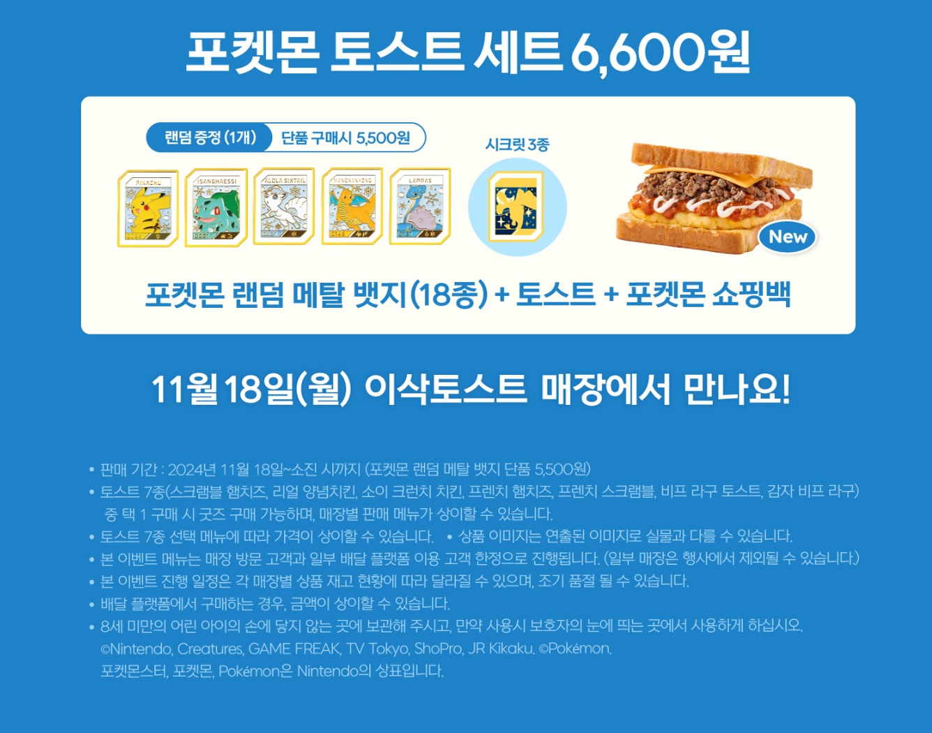 이삭토스트에서 2024년 11월 18일 월요일부터 포켓몬 토스트 세트를 6,600원에 판매한다고 합니다.