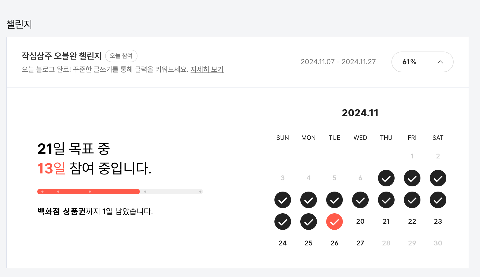 티스토리에서 11월에 오늘 블로그 완료, 줄여서 오블완이라는 이벤트가 진행중입니다.