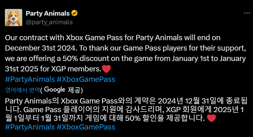 파티애니멀즈 제작사에서 자사의 공식 x계정을 통해 엑스박스 게임패스 회원에게 2025년 1월 1일부터 1월 31일까지 게임 구매 비용을 50% 할인을 하겠다는 공지를 올렸습니다.