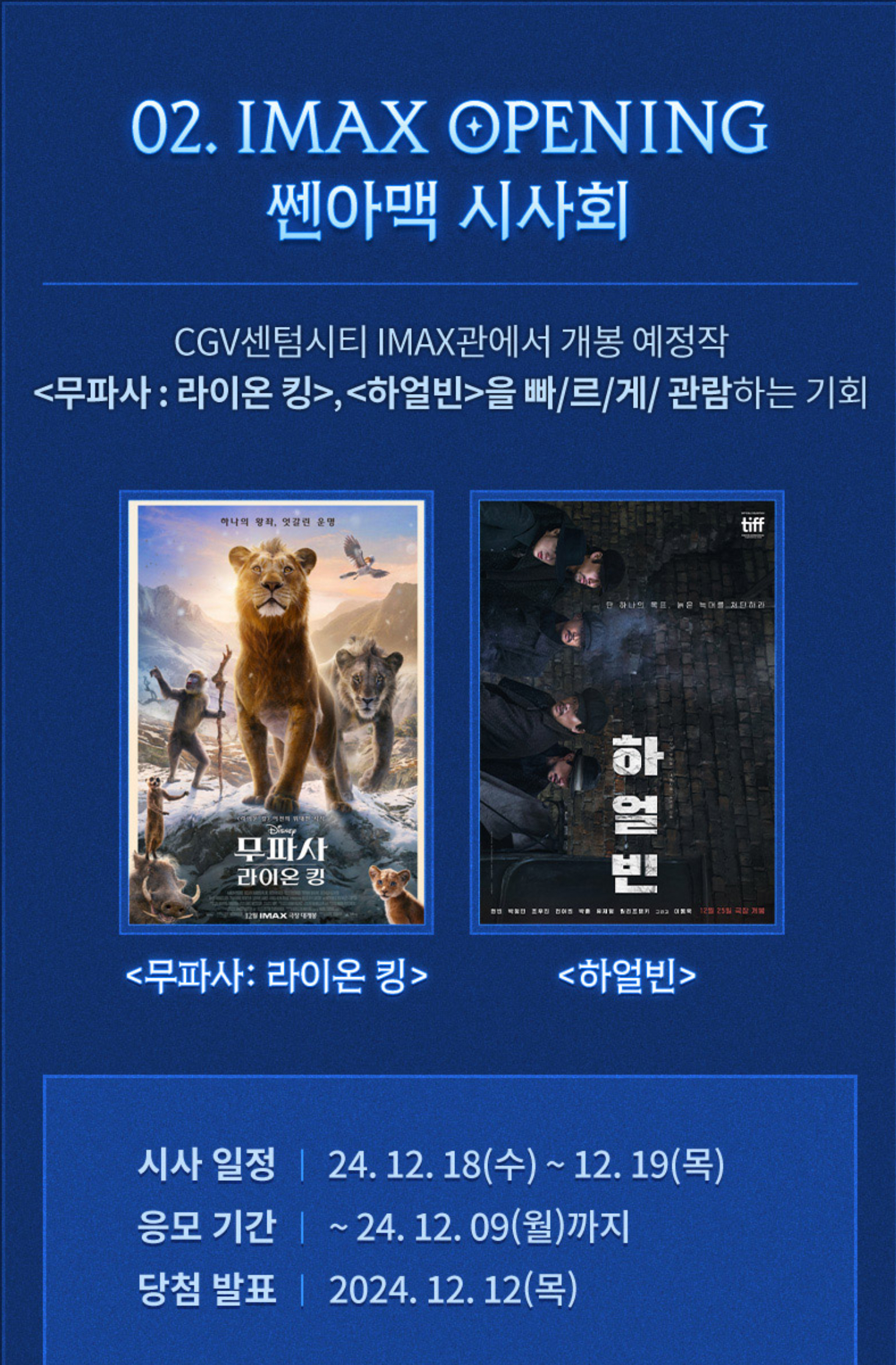 두 번째 이벤트는 개봉 예정작인 무파사:라이온 킹과 하얼빈의 시사회가 열릴 예정입니다.