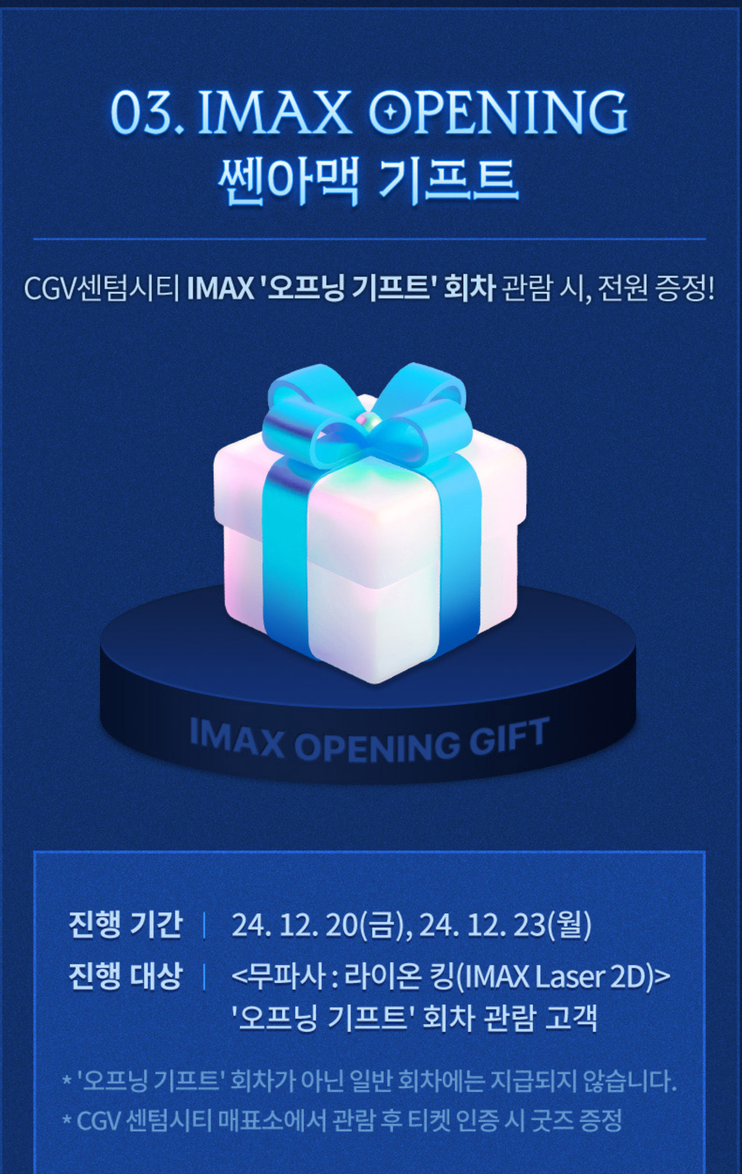 12월 20일 금요일과 23일 월요일에 무파사 라이온 킹을 '오프닝 기프트' 상영 회차로 관람한 모든 고객에게 아이맥스 오프닝 기프트를 증정하는 이벤트입니다. 일반회차에선 지급되지 않고 관함 후 티켓을 현장에서 인증하면 굿즈를 받으실 수 있습니다. 관람일 당일에만 굿즈를 수령할 수 있다는 점 꼭 확인하시기 바랍니다.