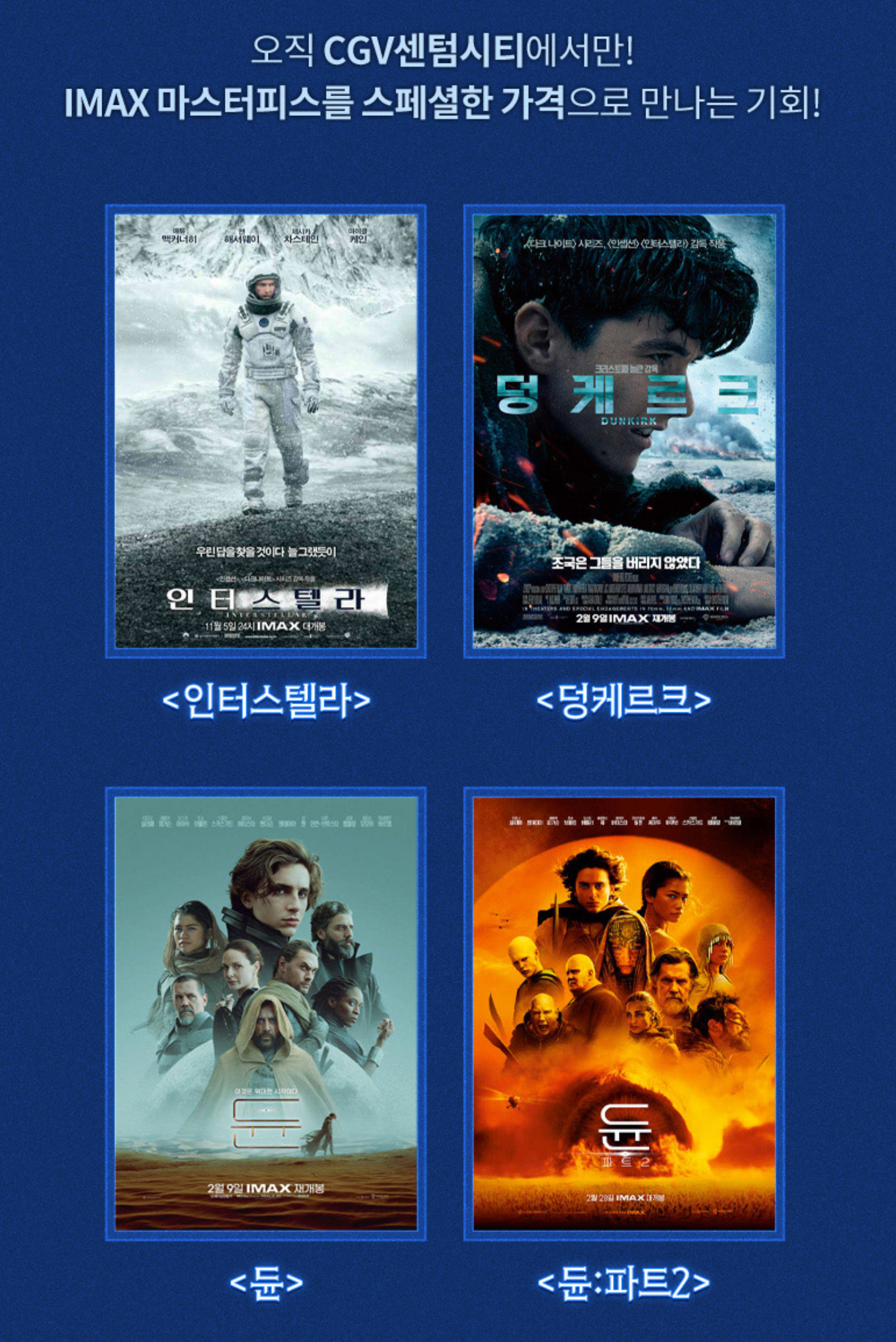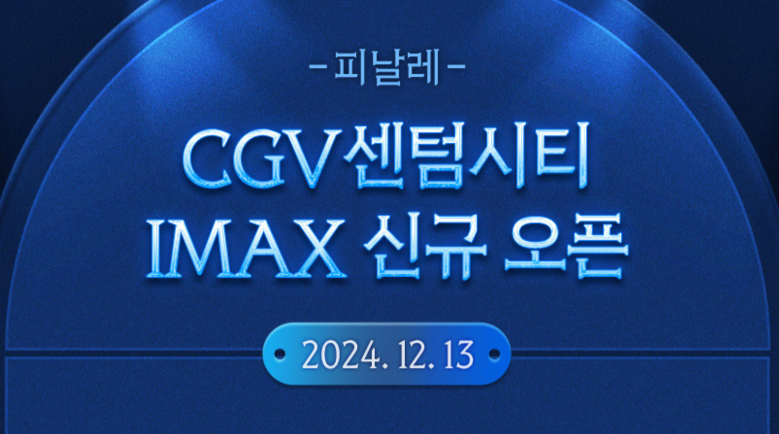 Share > FaceBook Twitter --> 스페셜이벤트 CGV센텀시티 IMAX 신규 오픈 기간: 2024.12.06 ~ 2024.12.31 새로운 IMAX의 막이 오르다 2024 IMAX OPENING -피날레- "드.디.어 쎈-아맥이 온다." 국내 두 번째로 큰 스크린의 IM