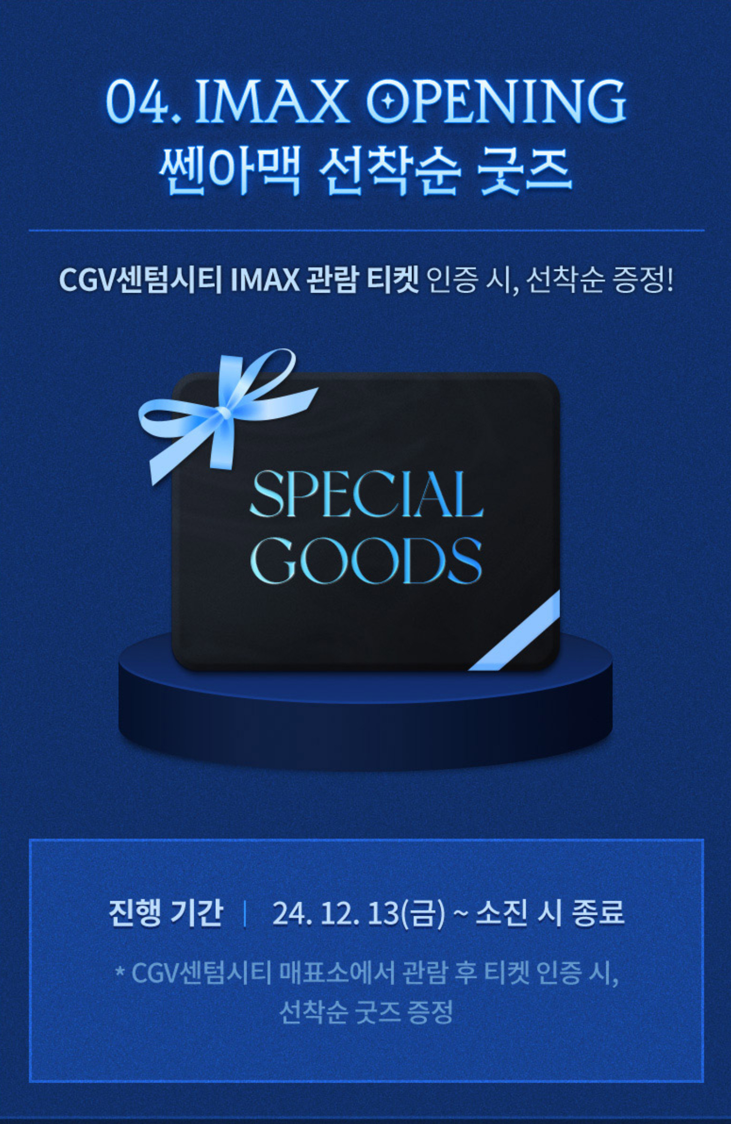 그리고 마지막으로 개관일인 12월 13일 금요일부터 IMAX관람 티켓을 인증하면 선착순으로 스페셜 굿즈를 지급한다고 합니다.