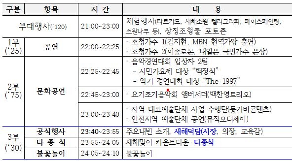 올 해도 송년제야문화축제라는 이름으로 12월 31일에 인천문화예술회관 야외광장에서 열린다고 합니다.