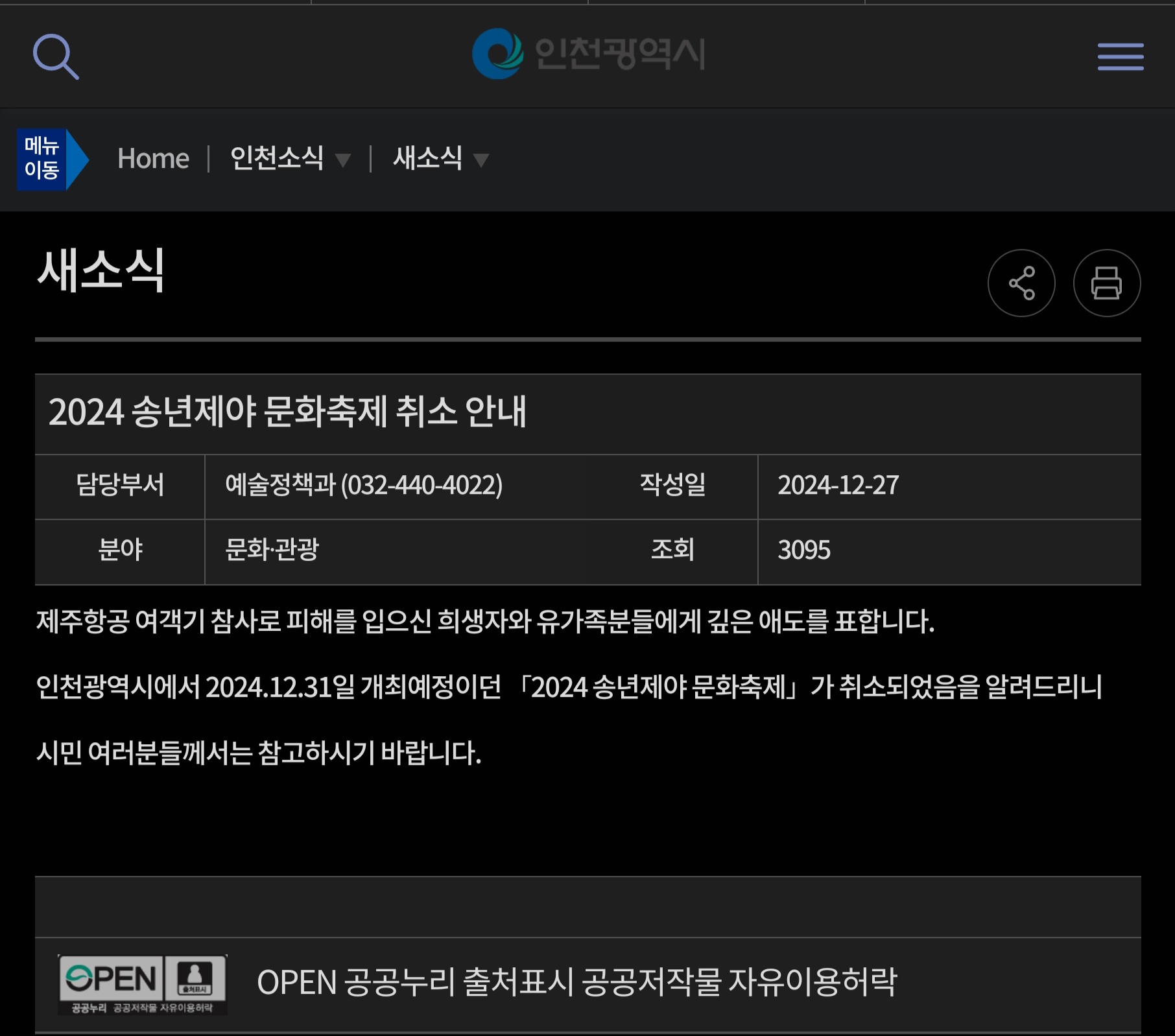 이에 인천광역시도 올 해는 송년제야행사를 취소한다고 오늘 시청 홈페이지에 공식적으로 글이 올라왔습니다.