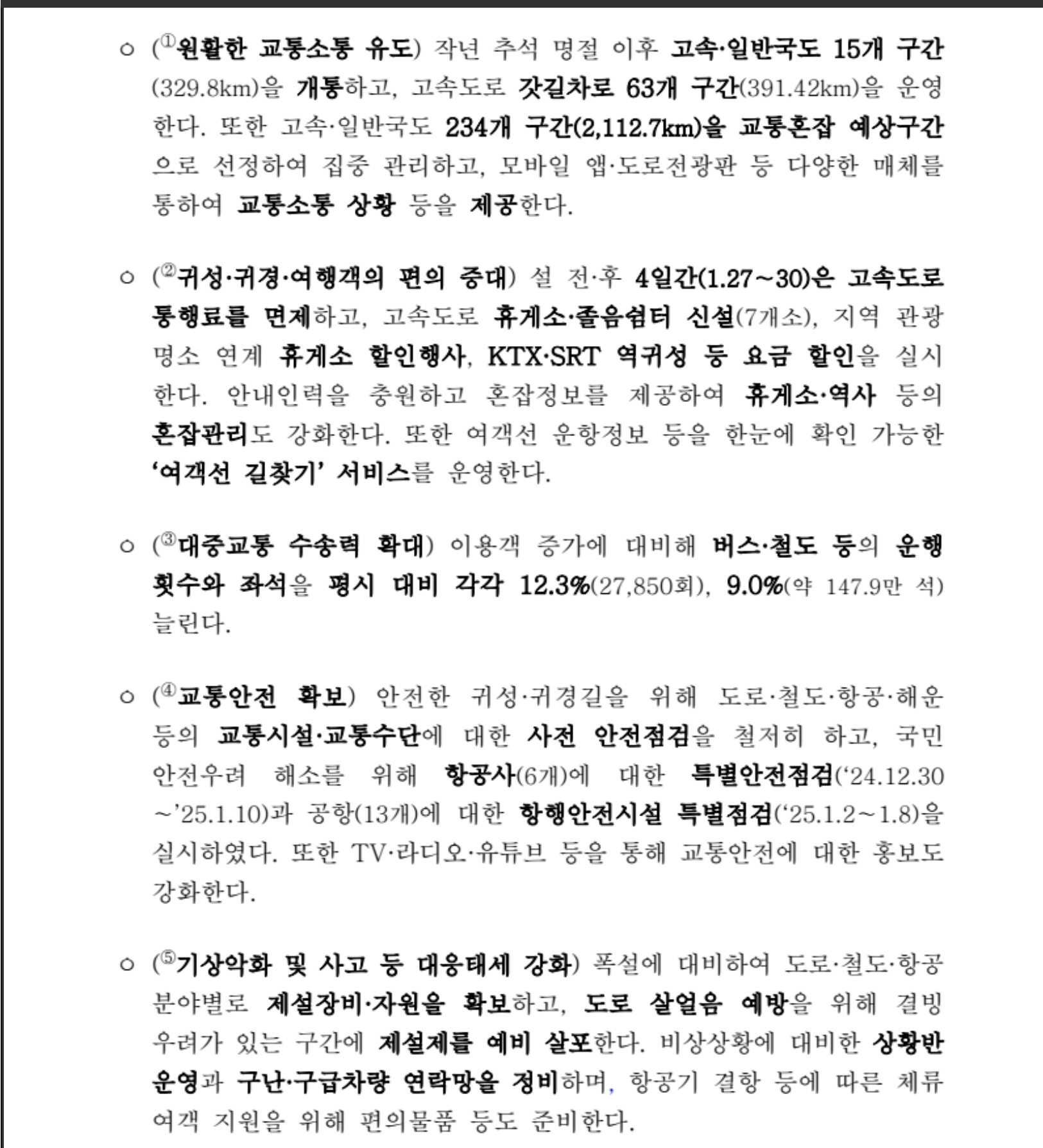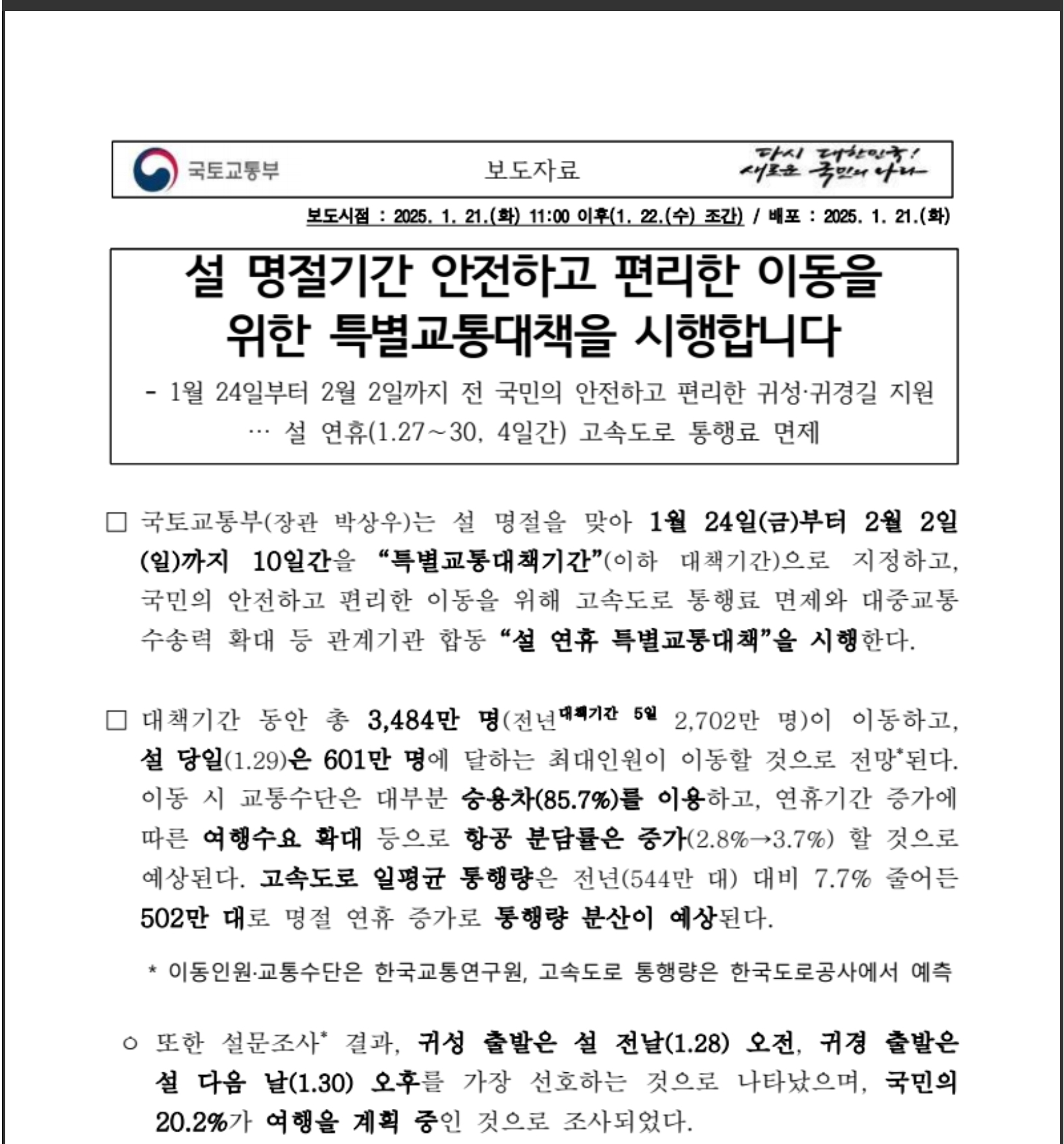 하지만 오늘 국토교통부에서 공개한 '설 연휴 특별교통대책' 보도자료를 보시면