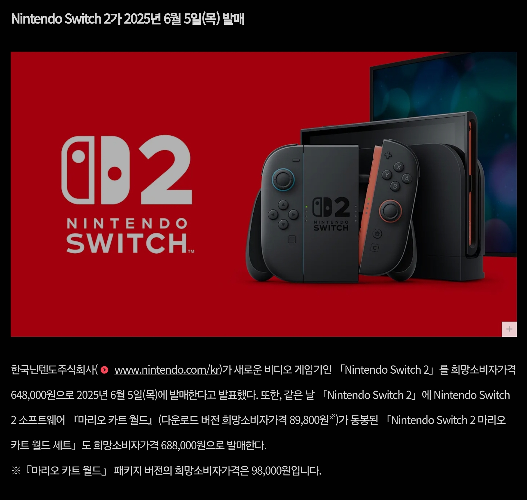가격은 64만 8천원에 판매 할 예정입니다. 그리고 마리오카트월드가 동봉된 닌텐도 스위치2 마리오카트 월드 세트는 68만 8천원에 판매 될 예정이라오 합니다.