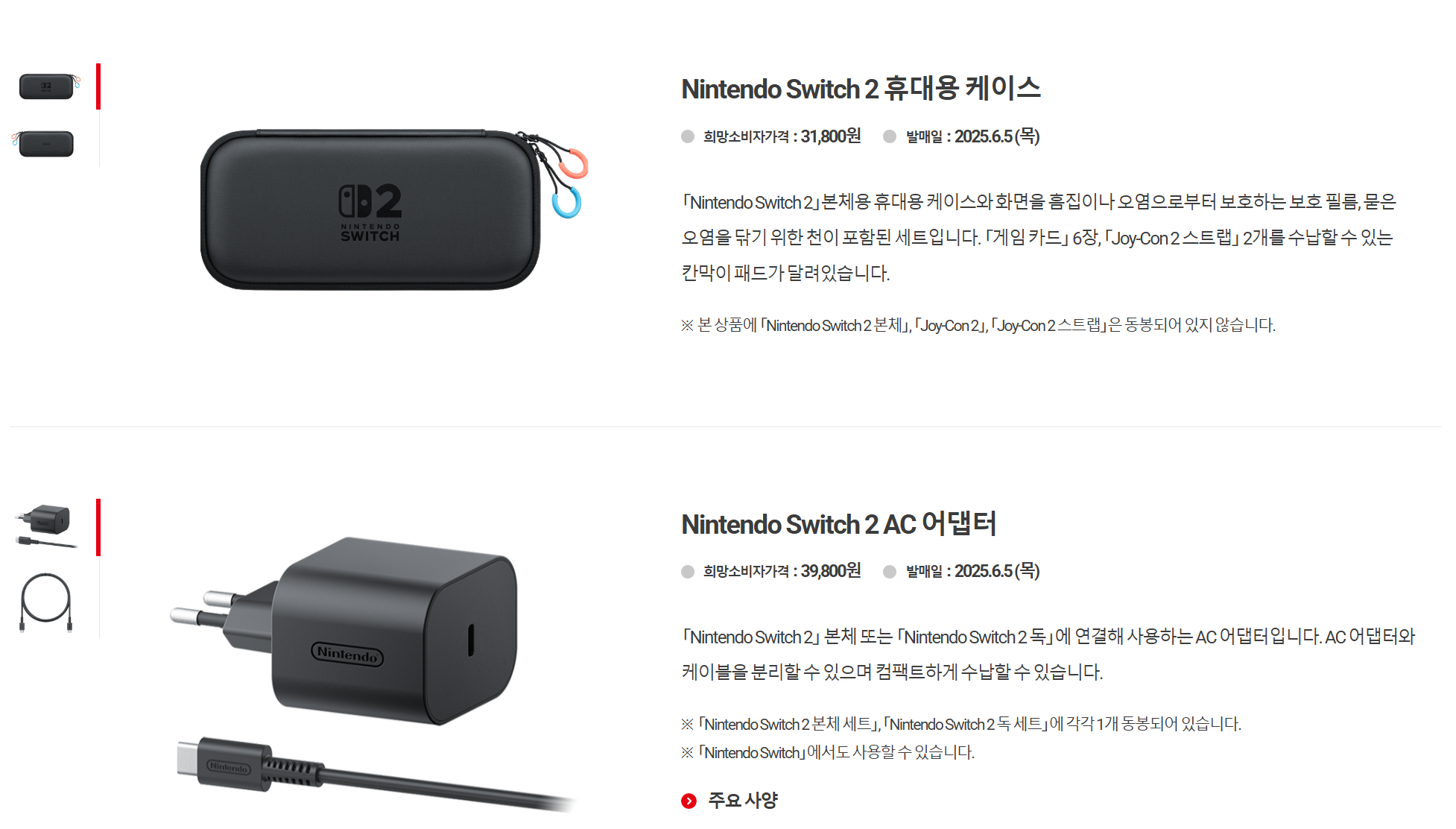스위치2 휴대용 케이스는 31800원, 공식 ac충전기는 39800원입니다.