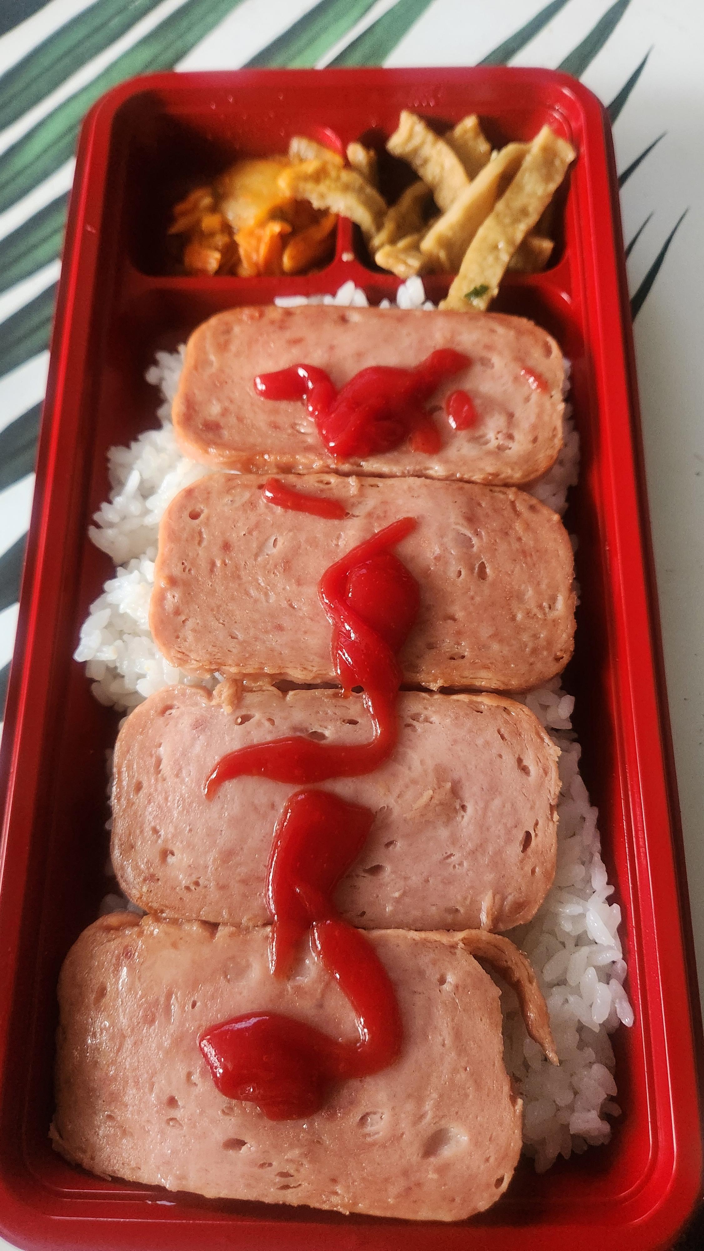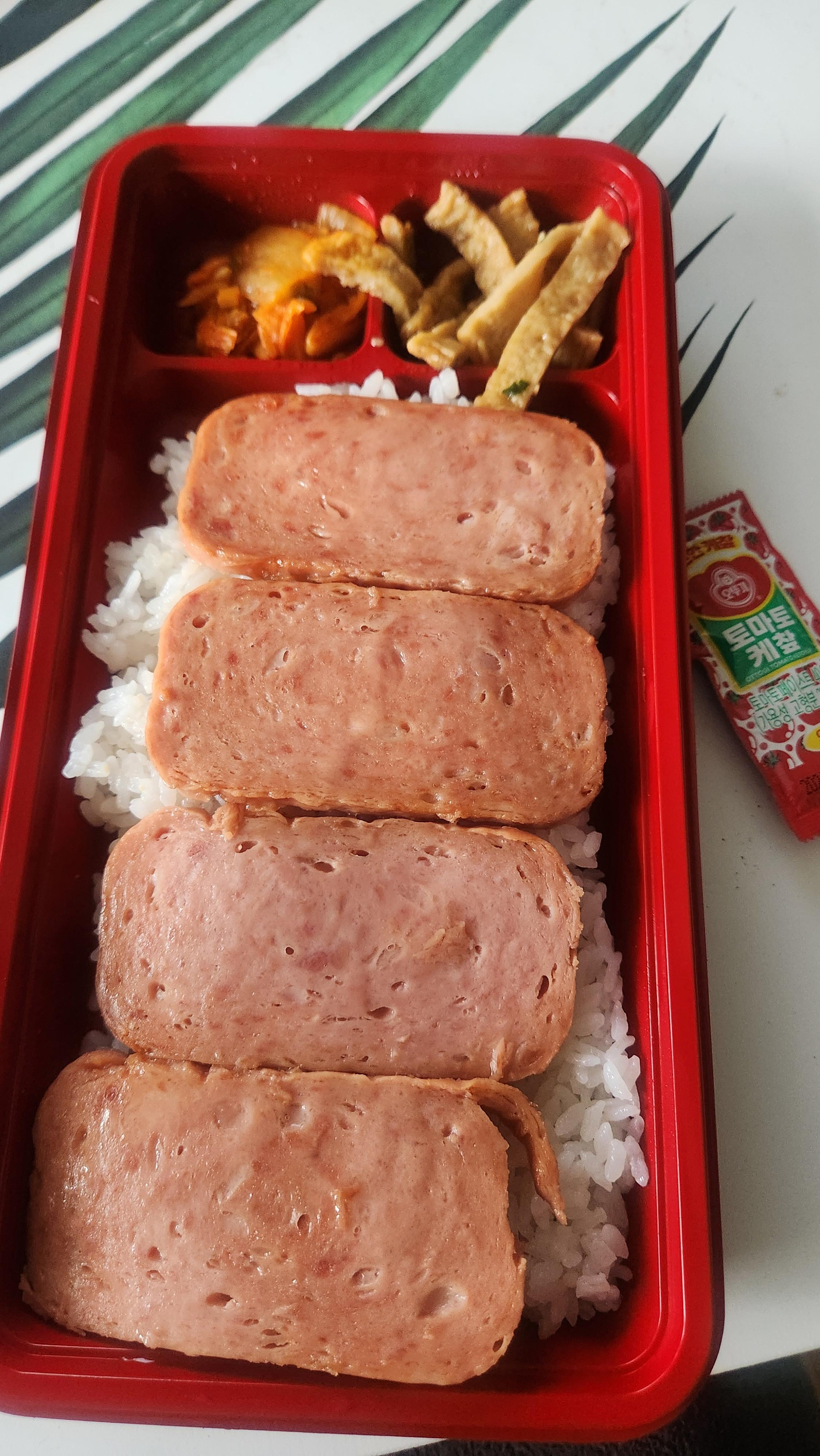 햄 4덩이와 밥이 있고 반찬으로는 배추김치와 어묵이 있습니다. 그리고 햄에 바를 수 있는 케첩소스가 같이 함유되어 있습니다.
