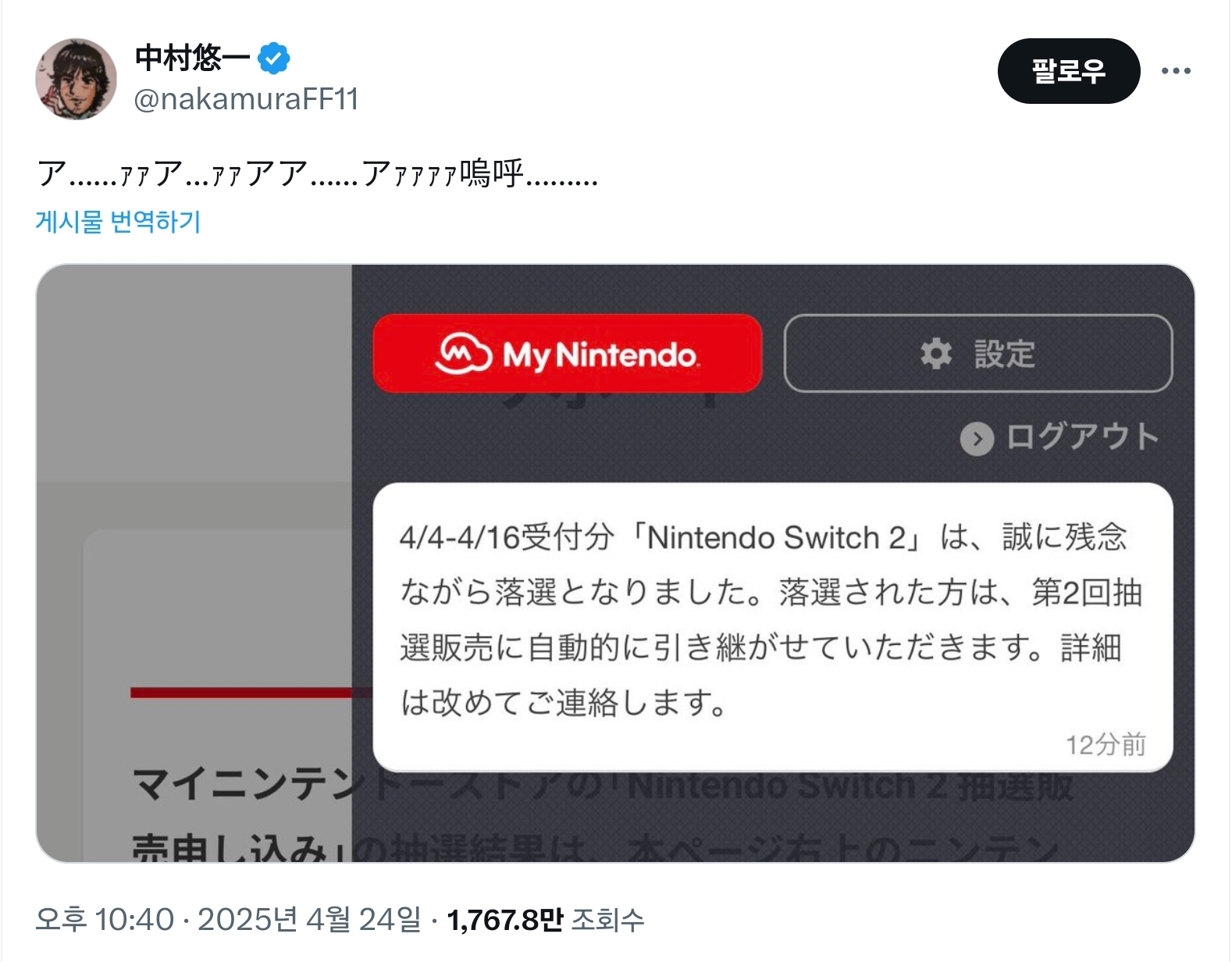 스위치의 주요 소식을 전달했던 닌텐도 다이렉트. 이 닌텐도 다이렉트의 일본 성우인 나카무라 유이치 성우도 이번 추첨에서 당첨되지 않았다는 글을 SNS에 게시하기도 했지요. 그 외에 대난투나 커비 시리즈 신작 에어라이더를 개발중인 사쿠라이 마사히로 프로듀서는 다국어판 당첨 소식을 알리기도 했습니다. 닌텐도 관련자라고 해서 무조건 스위치2를 받을 수 있는 것은 아닌가 봅니다.-5월 초 다시 2차 응모 예정?