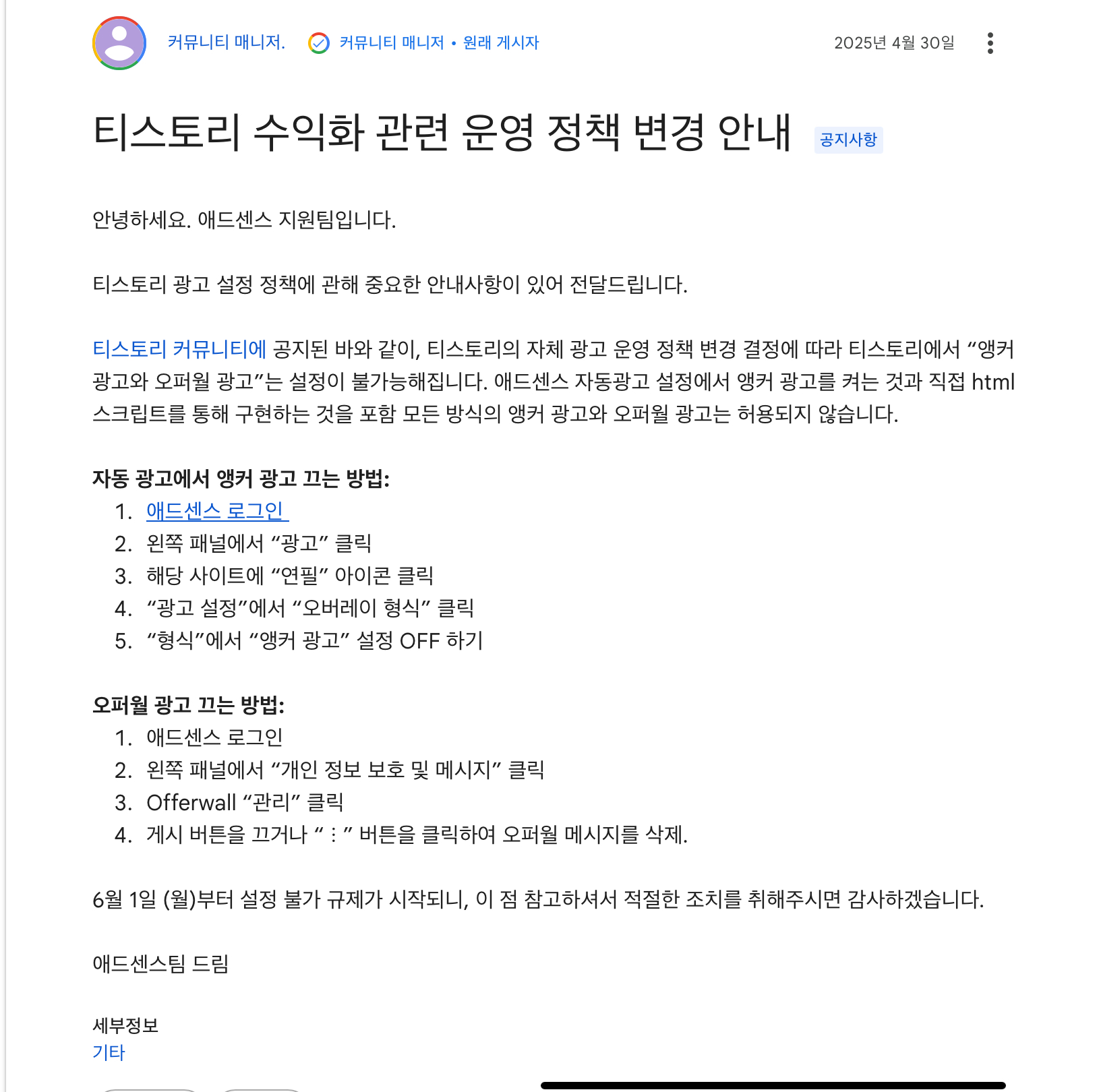 티스토리 블로그 수익화 공지 관련 - 애드센스 앵커 광고, 오퍼월 광고 설정 해제하기정보 2025. 5. 7. 12:50반응형
