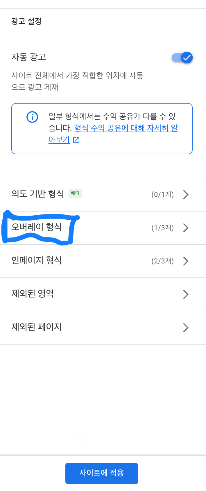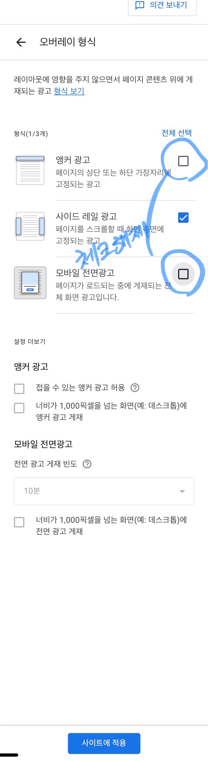여기서 '앵커 광고'와 '모바일 전면광고' 항목을 해제하고 사이트에 적용 버튼을 눌러주면 일단 앵커광고 설정은 해제됩니다.