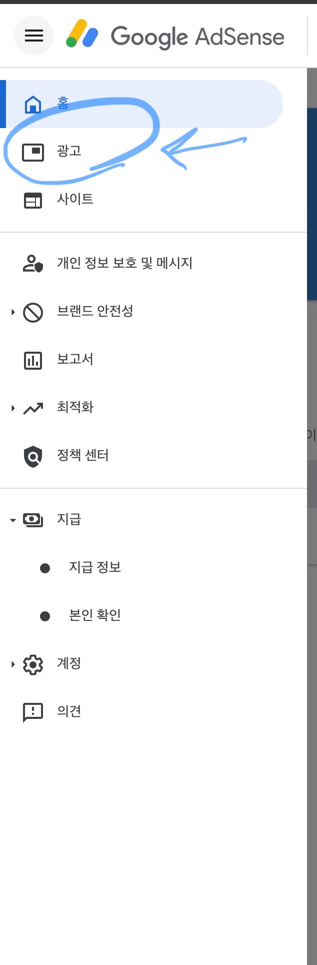 구글 애드센스 왼쪽 상단 메뉴 탭을 클릭한 후