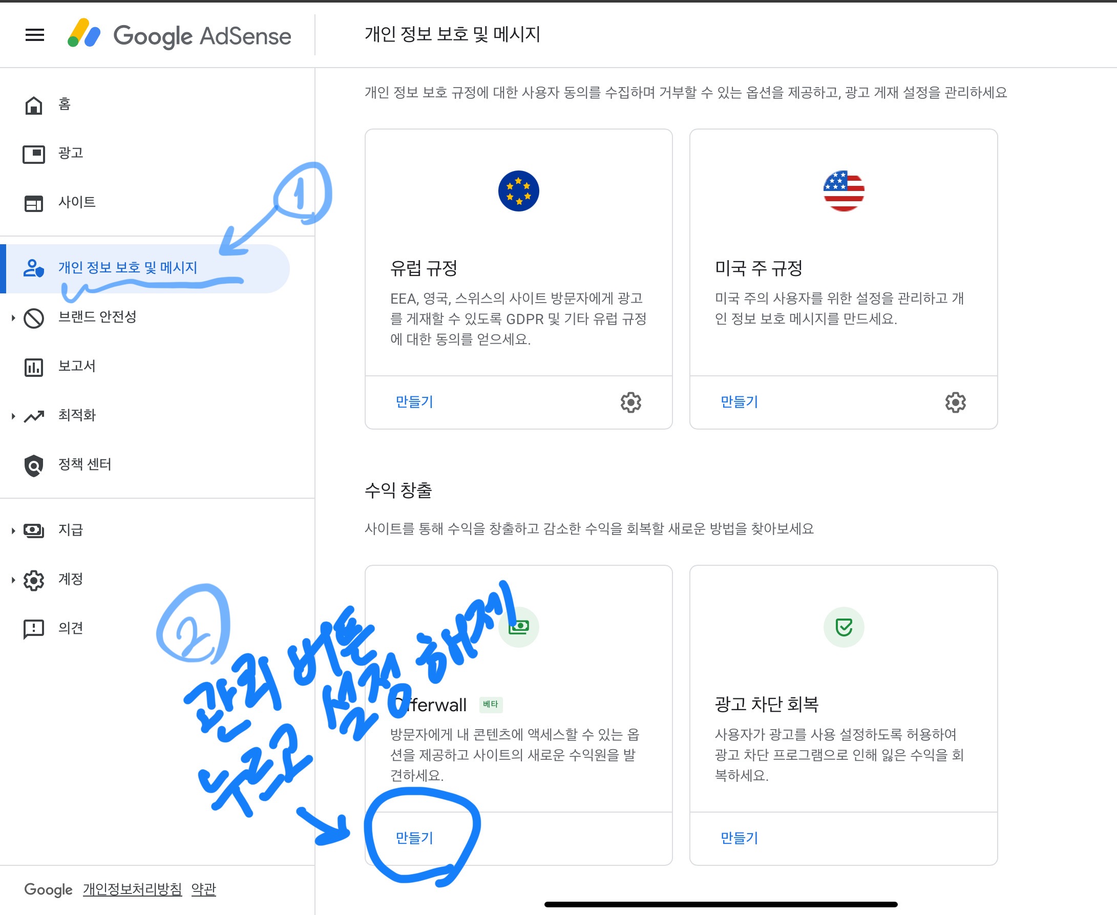 두 번째로는 구글 애드센스에서 앵커 광고와 오퍼월 광고 기능 활용을 설정 할 수 없다는 것입니다.