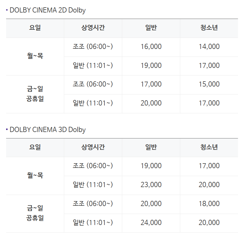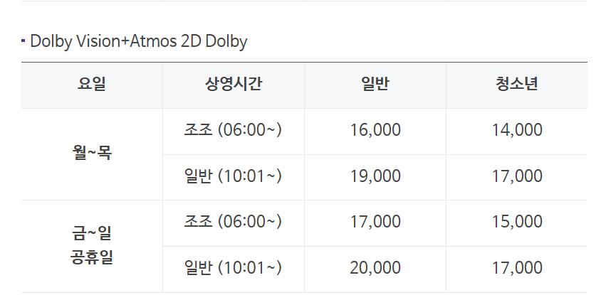 또 눈여겨 볼 점이 있는데요. 위의 요금표는 송도 돌비시네마관의 돌비포맷시의 요금표입니다.