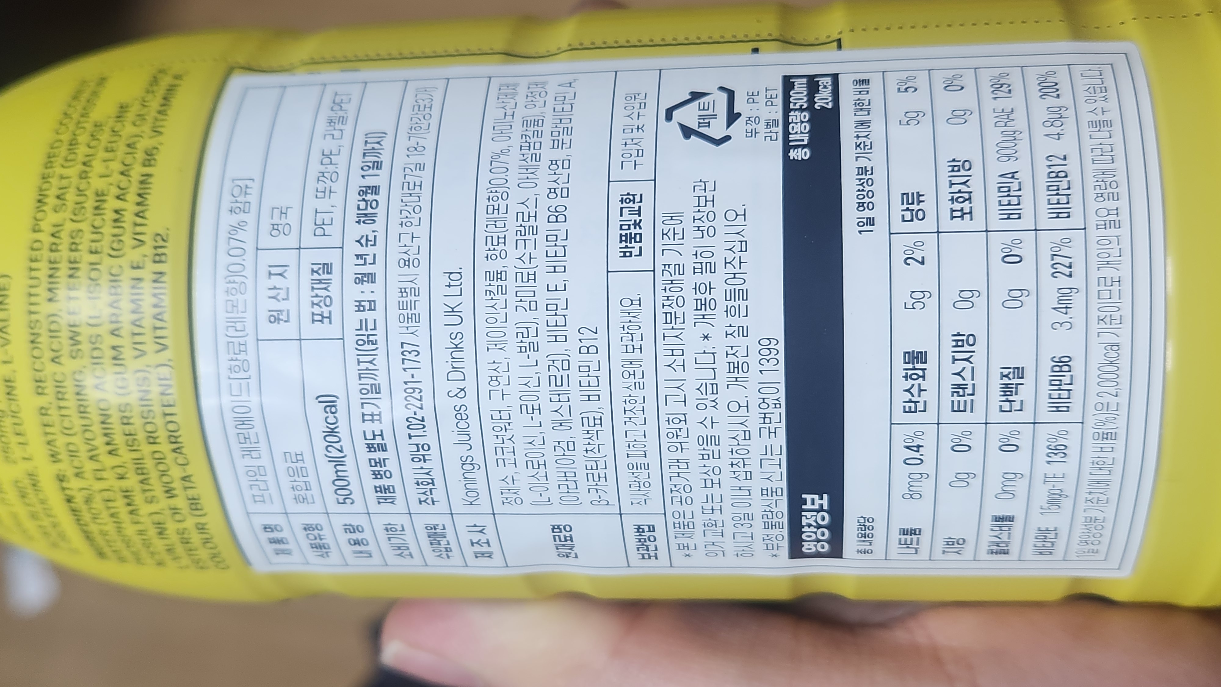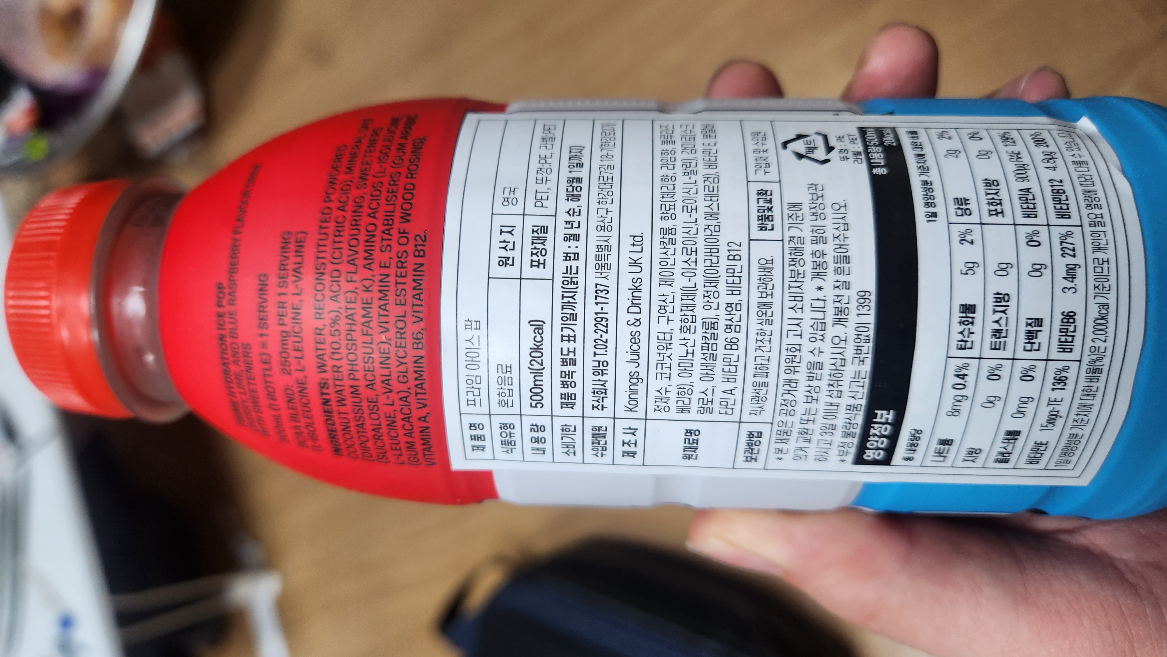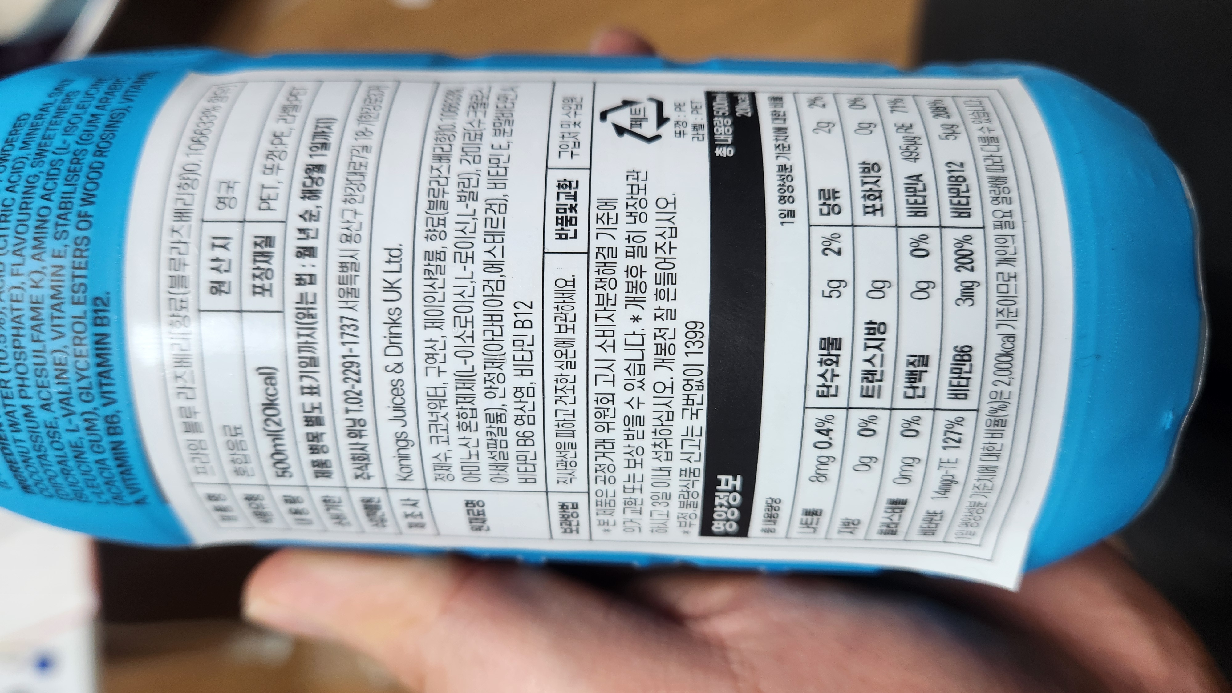 블루라즈베리, 아이스팝, 래모네이드 이렇게 3가지 맛이 있습니다. 특이한 점은 500ml 음료에 칼로리는 20칼로리밖에 안들어 있고 공통적으로 비타민 A, B6, B12, E가 한국인 하루 권장량 이상으로 들어있다는 점입니다.