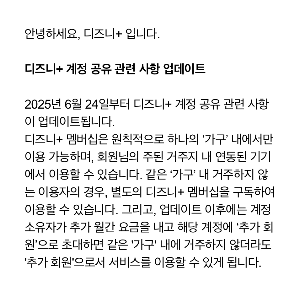 이미 아시는 분들은 다 아시겠지만 2025년 6월 24일부터 디즈니플러스도 넷플릭스에 이어 계정 공유제한 정책이 시행될 예정이라고 합니다. 그동안 해외에서는 먼저 시행되었지만 우리나라에서는 6월 24일부터 이 제한이 시행된다고 합니다.