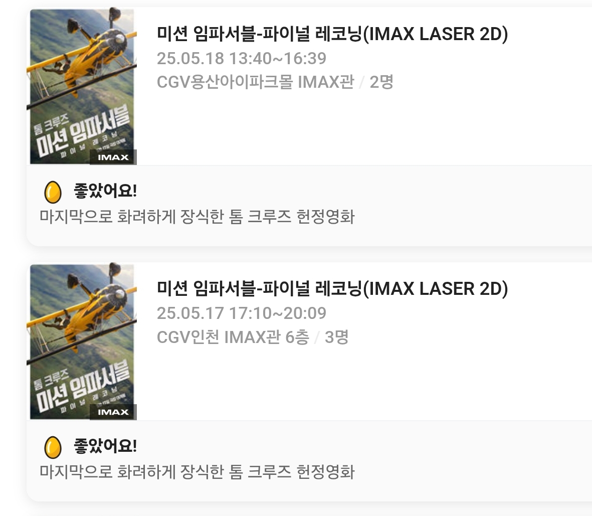 미션 임파서블: 파이널 레코닝 용아맥 vs 인천아맥 비교 후기영화 및 영상물/상영작 포맷 비교 2025. 5. 27. 00:20반응형