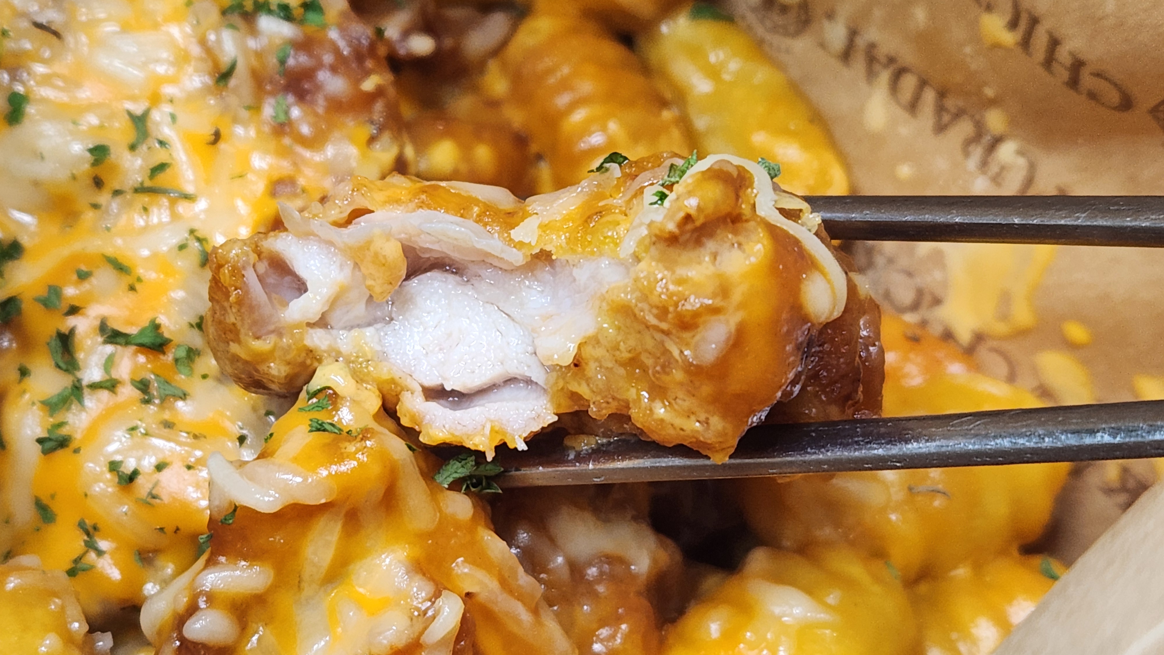 모든 순살치킨 덩어리들이 치즈가 풍족하게 많이 묻어있는 모습입니다.