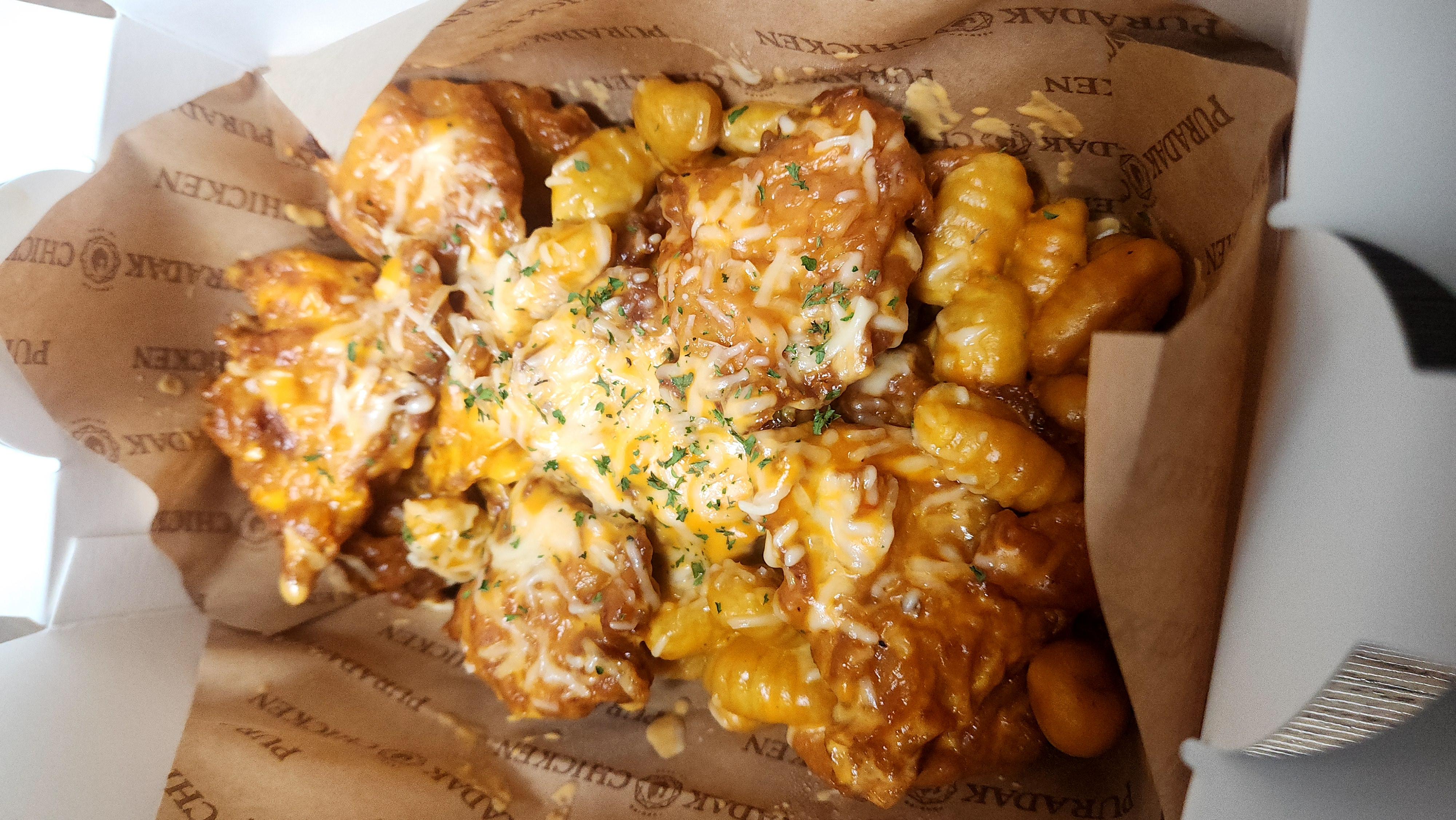 치즈를 많이 사용한 다른 치킨들의 경우 치즈의 느끼함을 없애기 위해 매운맛을 넣어 맛대 맛으로 느끼함을 '중화'시킨다는 느낌인데, 이 나폴리 투움바치킨의 경우는 뇨끼를 통해 느끼함을 '희석'하는 느낌입니다.