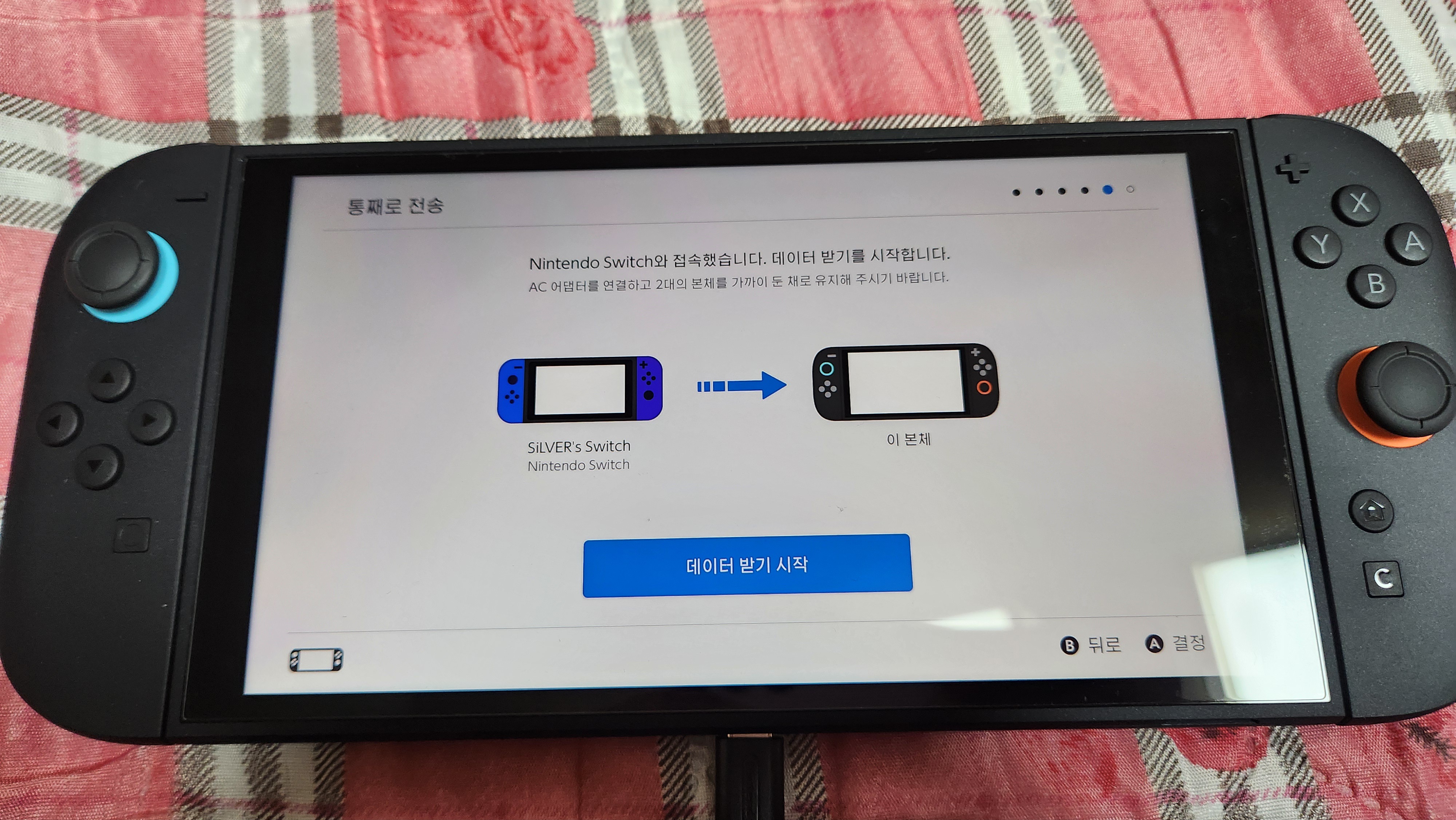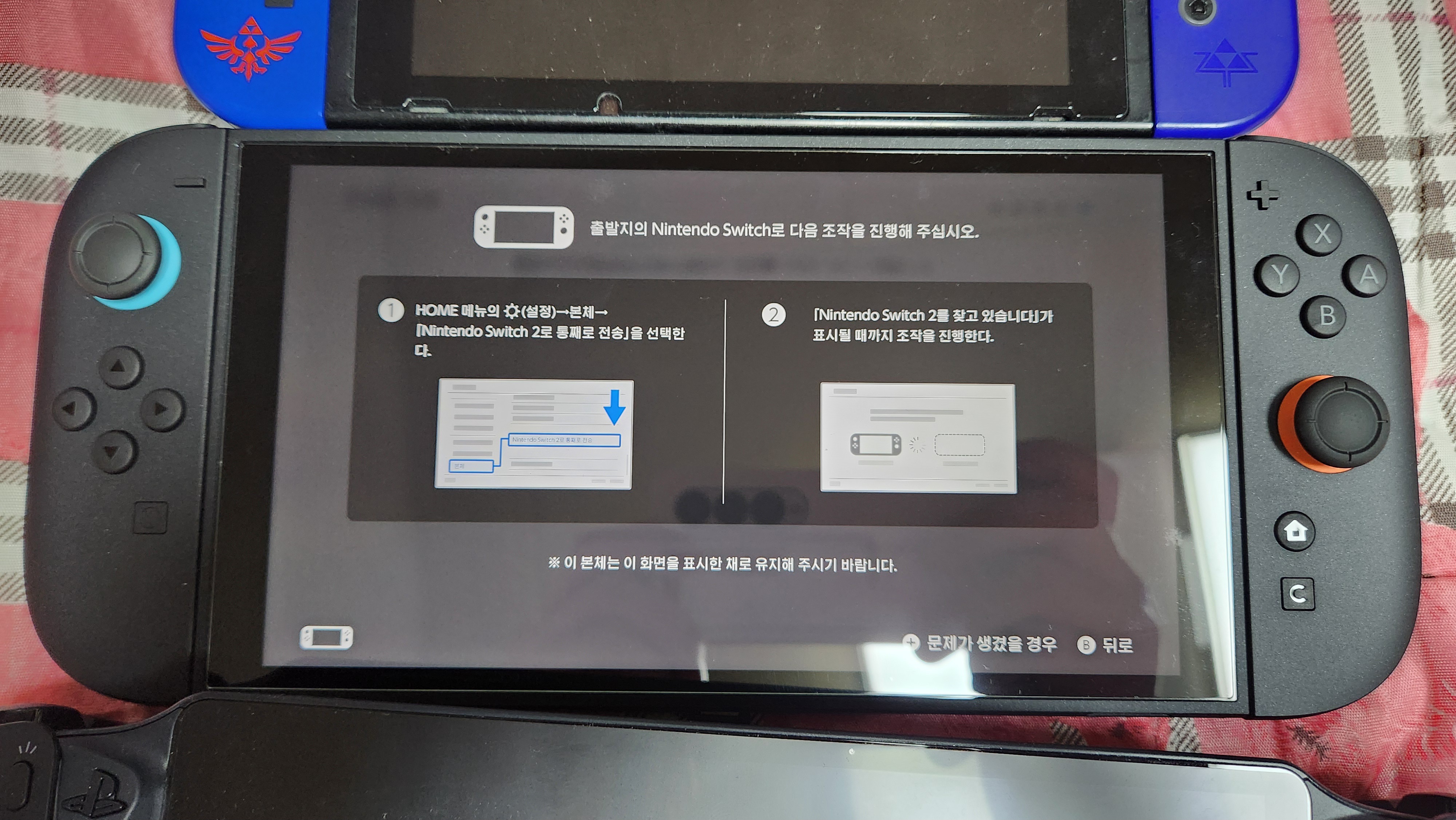 이게 스위치2와 스위치1 두 기기 모두 충전 케이블을 본체에 꽂아 둔 상태여야지 데이터 이전이 가능합니다.