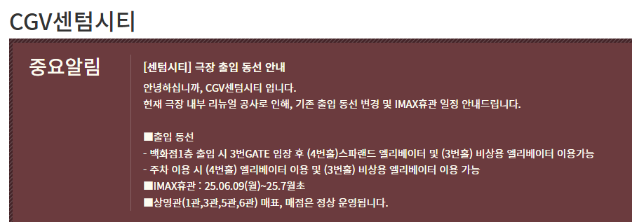 안녕하십니까, CGV센텀시티 입니다. 현재 극장 내부 리뉴얼 공사로 인해, 기존 출입 동선 변경 및 IMAX휴관 일정 안내드립니다. ■출입 동선 - 백화점1층 출입 시 3번GATE 입장 후 (4번홀)스파랜드