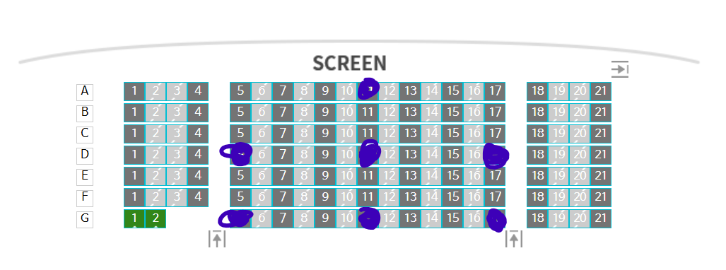 내부 상영관의 크기도, 스크린의 크기도 작은데요. 시선일치는 F열입니다. 하지만 개인적으로 D열에서 관람하는 것을 더 추천합니다. 제 개인적인 기준으로 구의역 돌비 비전 + 애트모스관의 명당은 C~F열의 7번부터 15번 좌석까지의 구역이 명당이라고 생각합니다. 스크린이 매우 작고 상단배치라 C열에서 누워서 보셔도 그렇게 부담이 된다는 느낌이 크지 않을 것입니다.