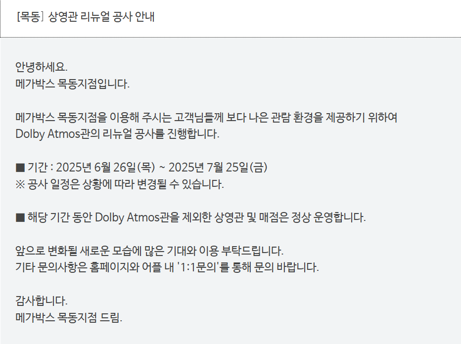 그런데 일명 DVA관의 론칭에서 얼마 지나지 않아 목동 메가박스의 돌비애트모스 DA관 (구 MX관)이 당장 6월 26일 목요일부터 한 달 가량 리뉴얼 공사를 진행한다는 공지가 떴습니다.