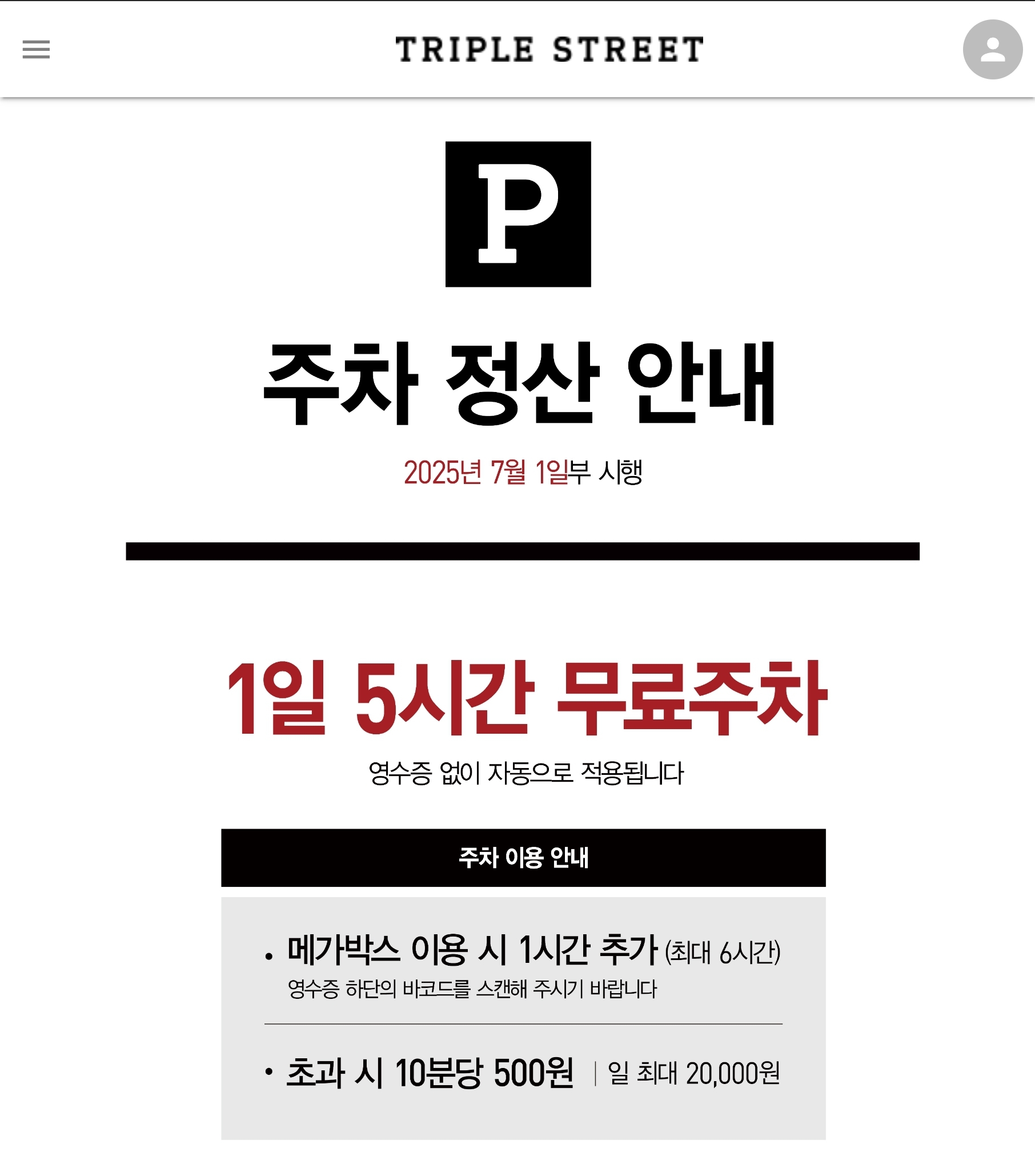그런데 이 곳 트리플스트리트의 지하주차장이 2025년 7월 1일부터 유료화로 전환 될 예정이라고 합니다.