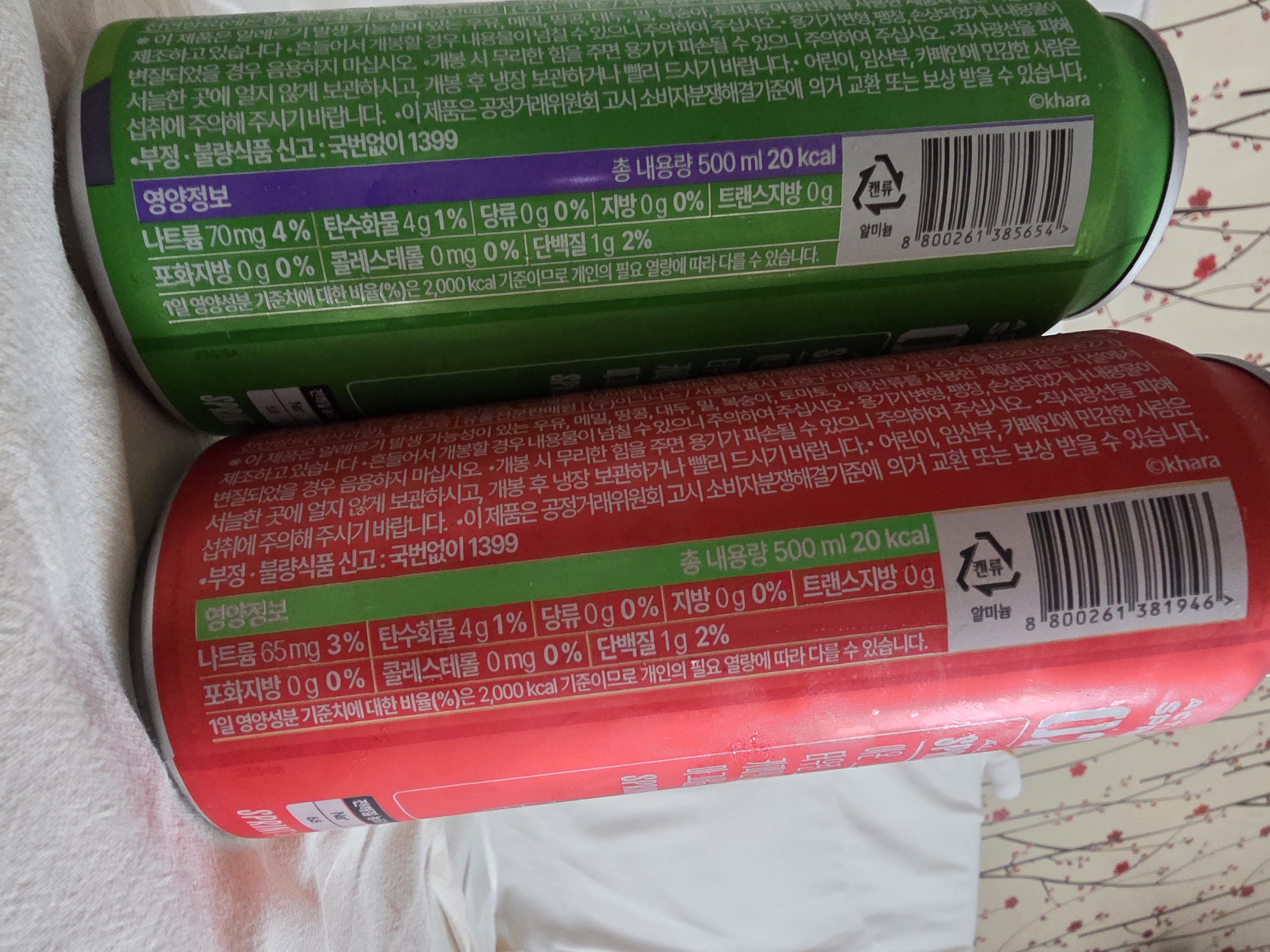 의외로 칼로리는 낮은 편입니다. 두 종류 모두 500ml캔에 20칼로리입니다.