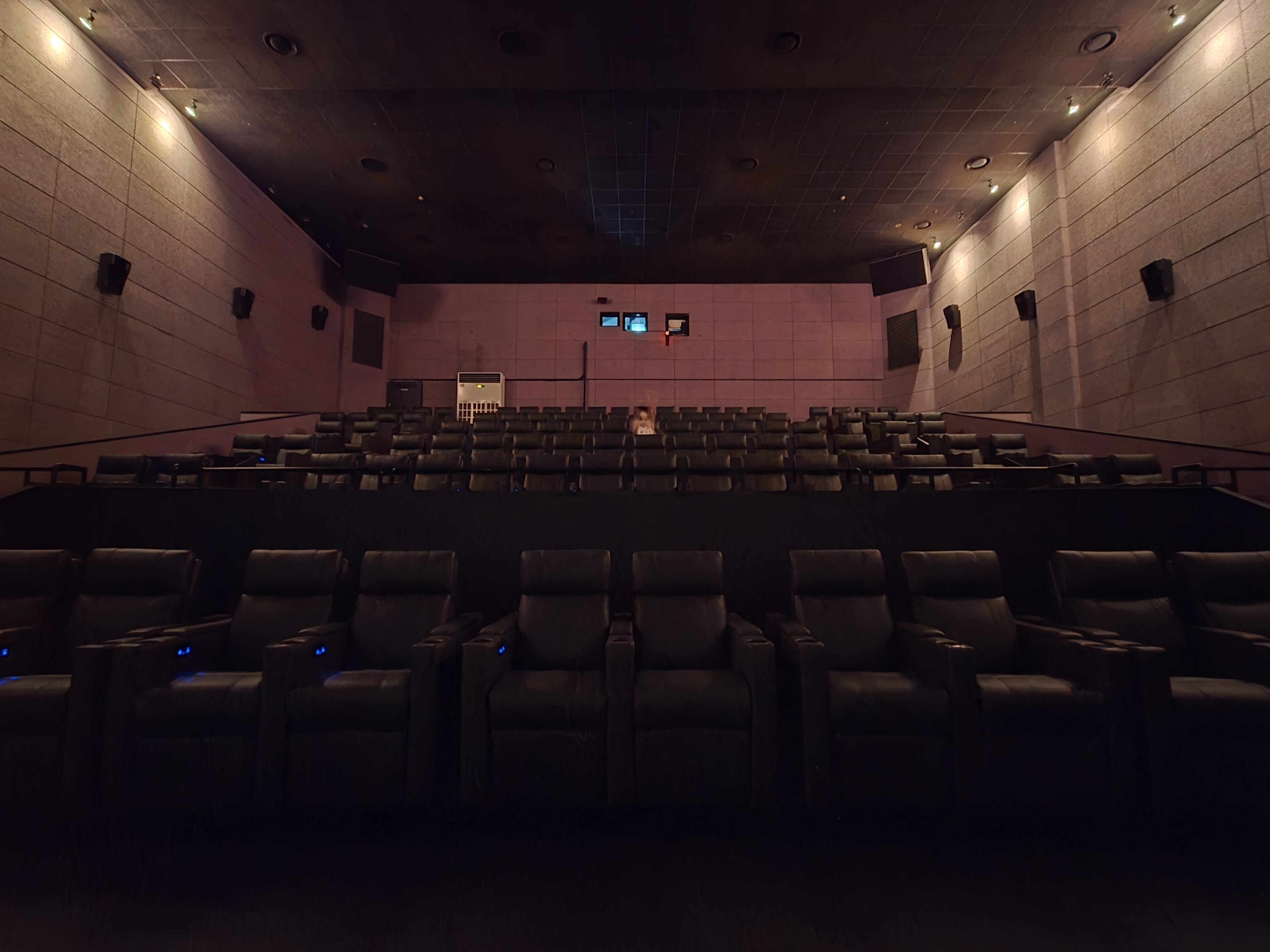 맨 뒤의 f열은 스크린 전체가 한 눈에 들어오는 구역이지만 천장 리어 스피커의 커버 영역에서 다소 벗어나고, 또 우측 뒷쪽에 있는 에어콘기기의 소음이 생각외로 큰 편이라 추천하지는 않습니다.