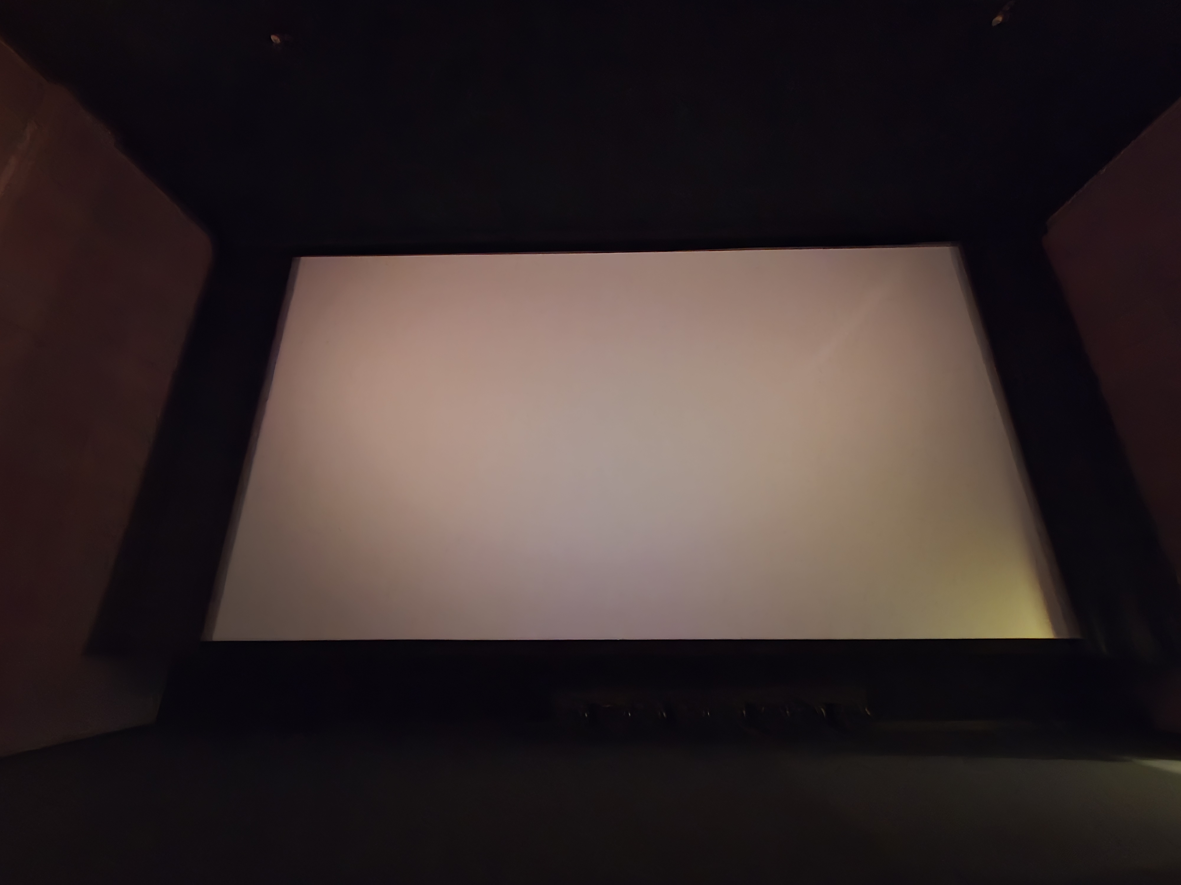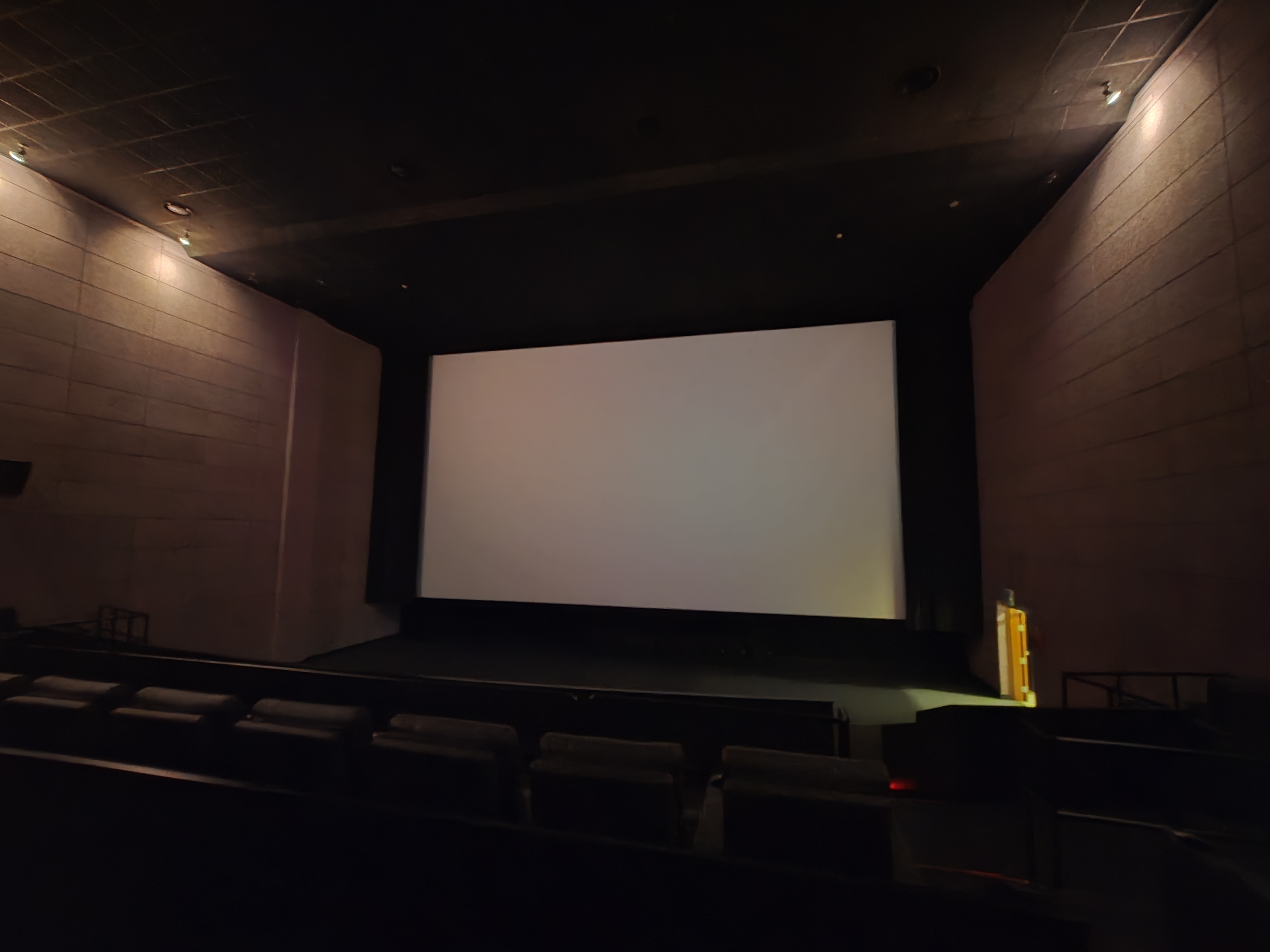 스크린은 시네마스코프비율의 스크린이며, 마스킹 장비가 있고 작동합니다.