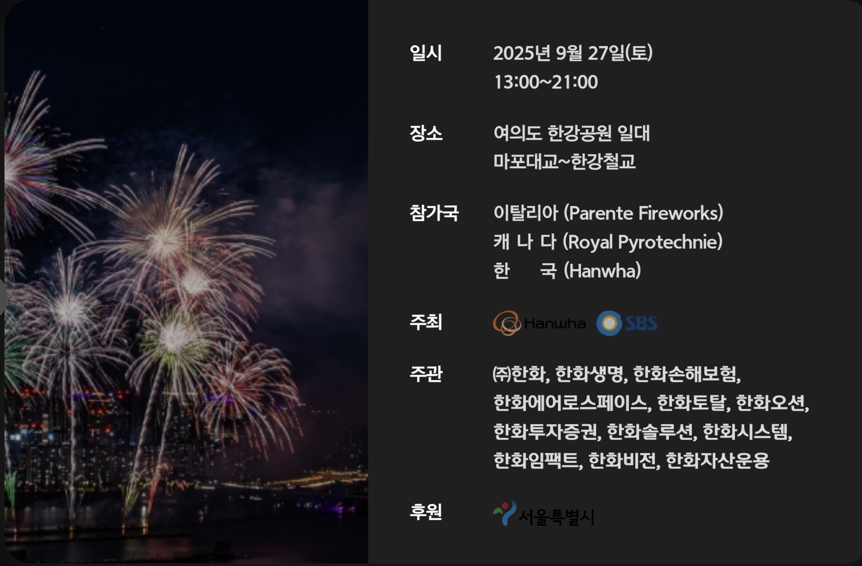 2025.09.27 서울세계불꽃축제 개최! 참가국과 일정 공개!정보/불꽃축제 2025. 8. 27. 12:33반응형