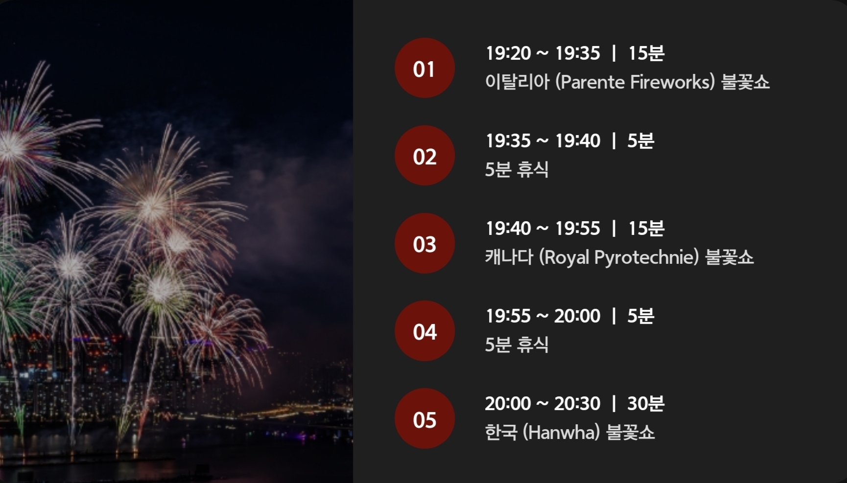 5분 간 휴식을 거쳐 마지막으로 20시부터 약 30분간 대한민국 한화팀의 불꽃쇼가 펼쳐질 예정이라고 합니다.