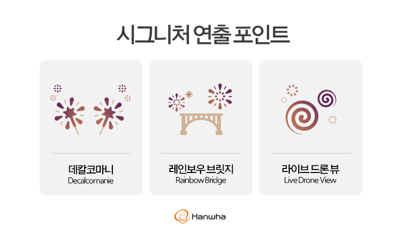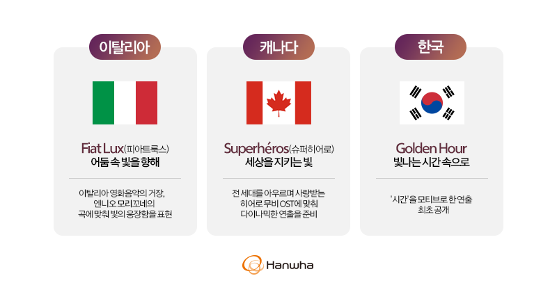 그리고 대망의 한국 한화팀은 'Golden Hour - 빛나는 시간 속으로' 라는 주제로 화려한 불꽃을 선보인다고 하는데요. 보도자료에서는 '시간'을 모티브로 한 연출을 최초로 공개한다고 나왔습니다. 보통 어떤 방식으로 연출을 선보인다고 하면 대략적인 예상이 가능하지만 이렇게 시간같이 형태가 딱히 정의되지 않는 추상적인 개념을 주제로 하면 더더욱 예측하기가 어렵습니다. 오히려 그렇기에 더더욱 기대감이 더 오릅니다.