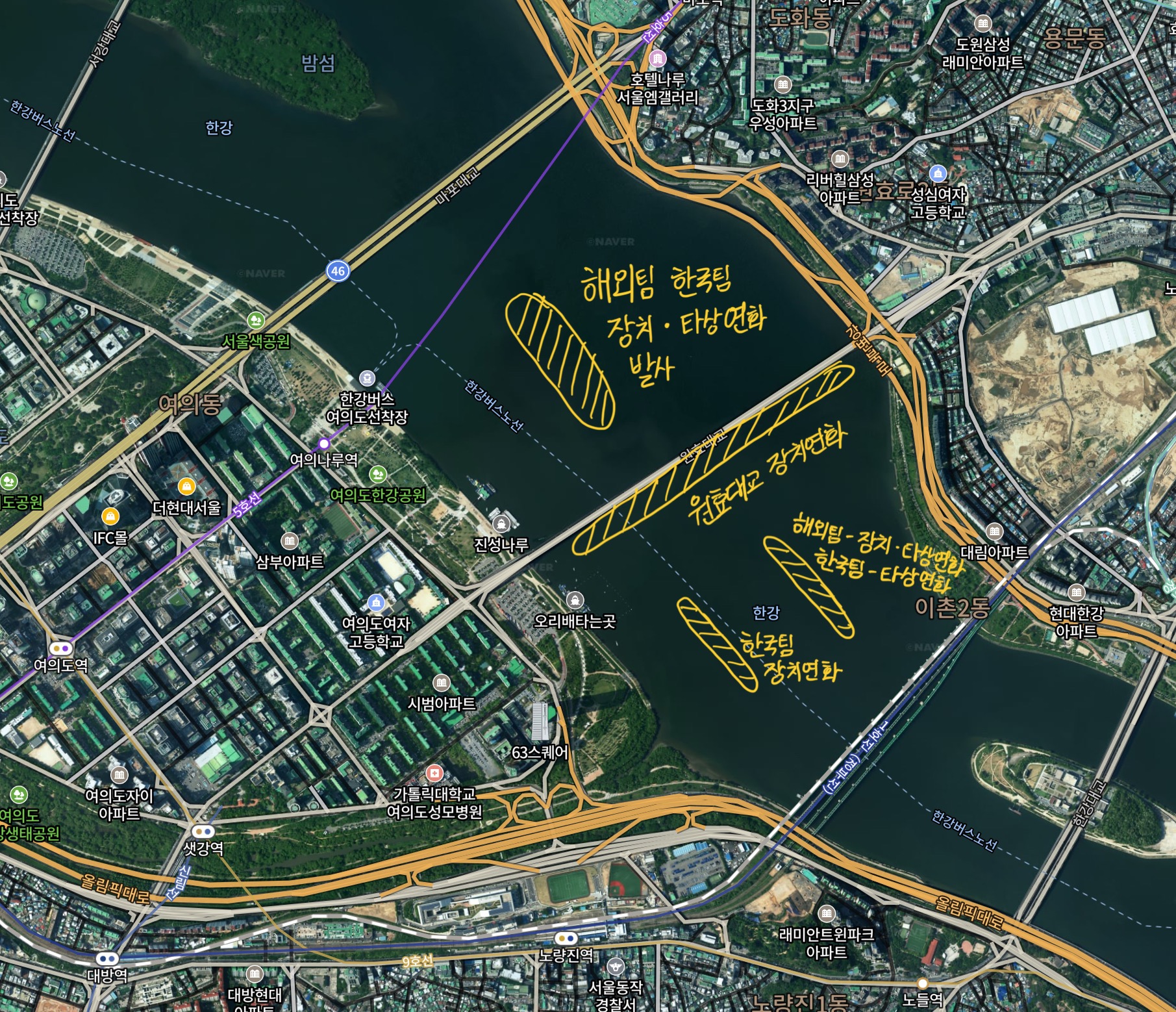 확실히 올 해는 해외팀들의 불꽃까지 2군데에서 동시에 발사될 것으로 예상이 되는 바, 원효대교에서의 장치연화를 포기한다면 마포대교쪽에서의 관람도 저는 개인적으로 매우 좋은 선택이 되지 않을까 생각합니다. 좀 더 관람 포인트의 선택지가 많아진다는 뜻이고 비좁게 여의도에서의 관람을 고집하지 않아도 되겠습니다.