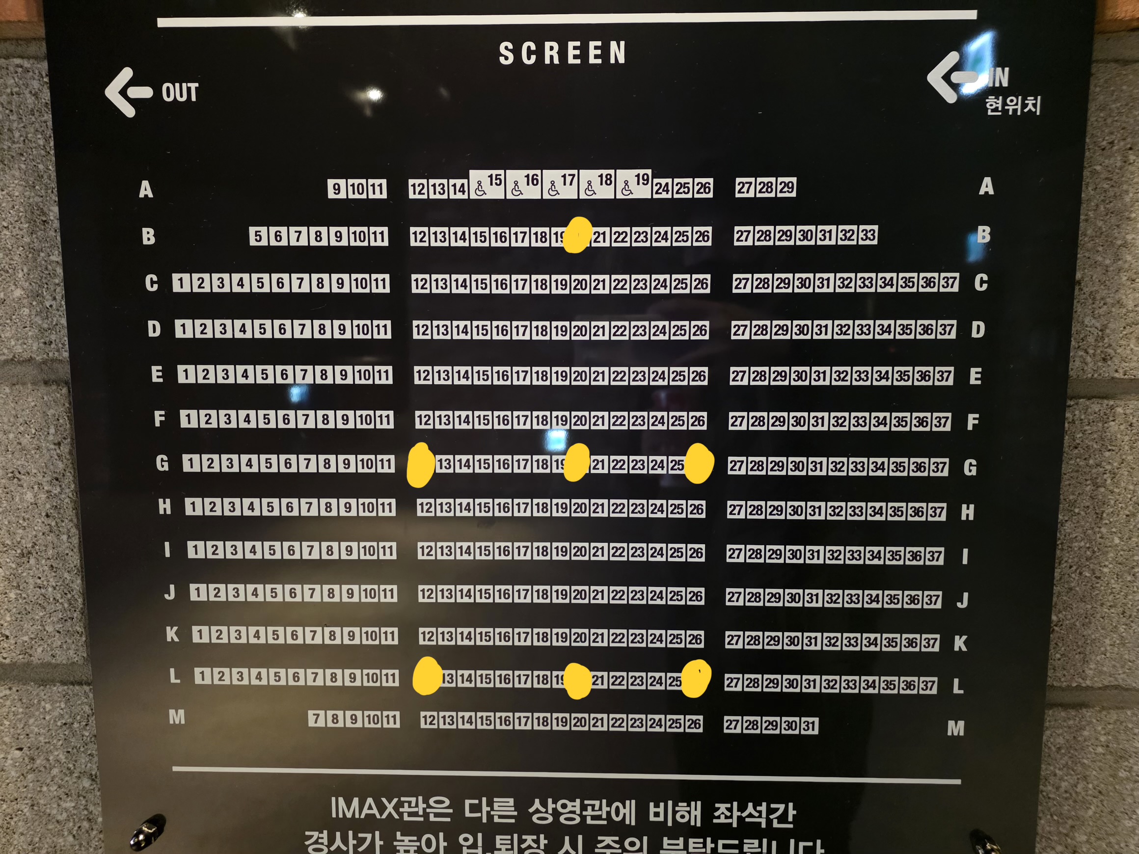 좌석의 시야가 일치되는 구역은 J,K열 정도가 됩니다. 스크린 크기가 크다보니 시야일치가 뒷쪽에서 되는 모습입니다.