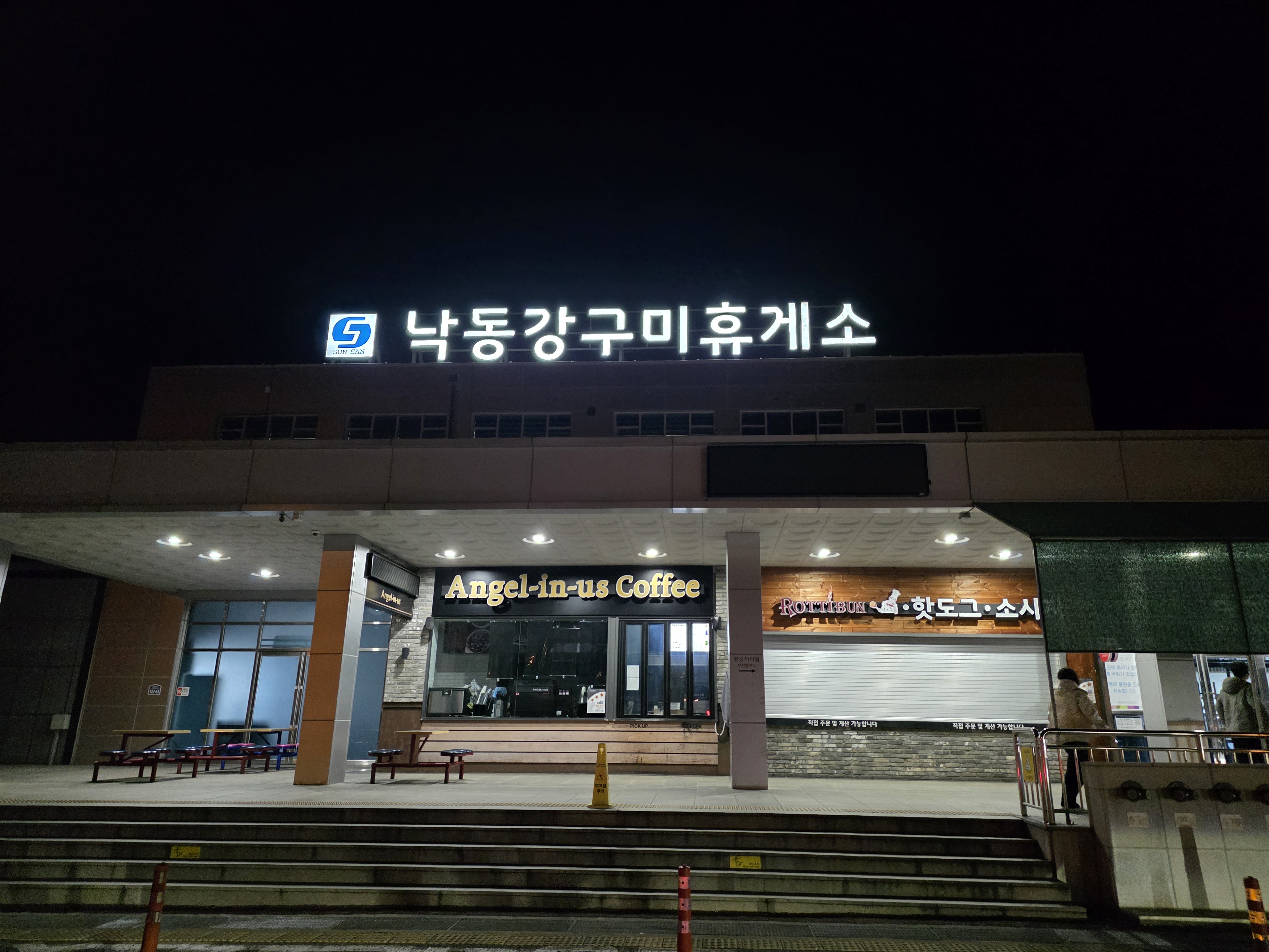 부산에서 오후 7시에 출발하여 이 곳 휴게소에 오후 8시 45분에 정차했습니다.