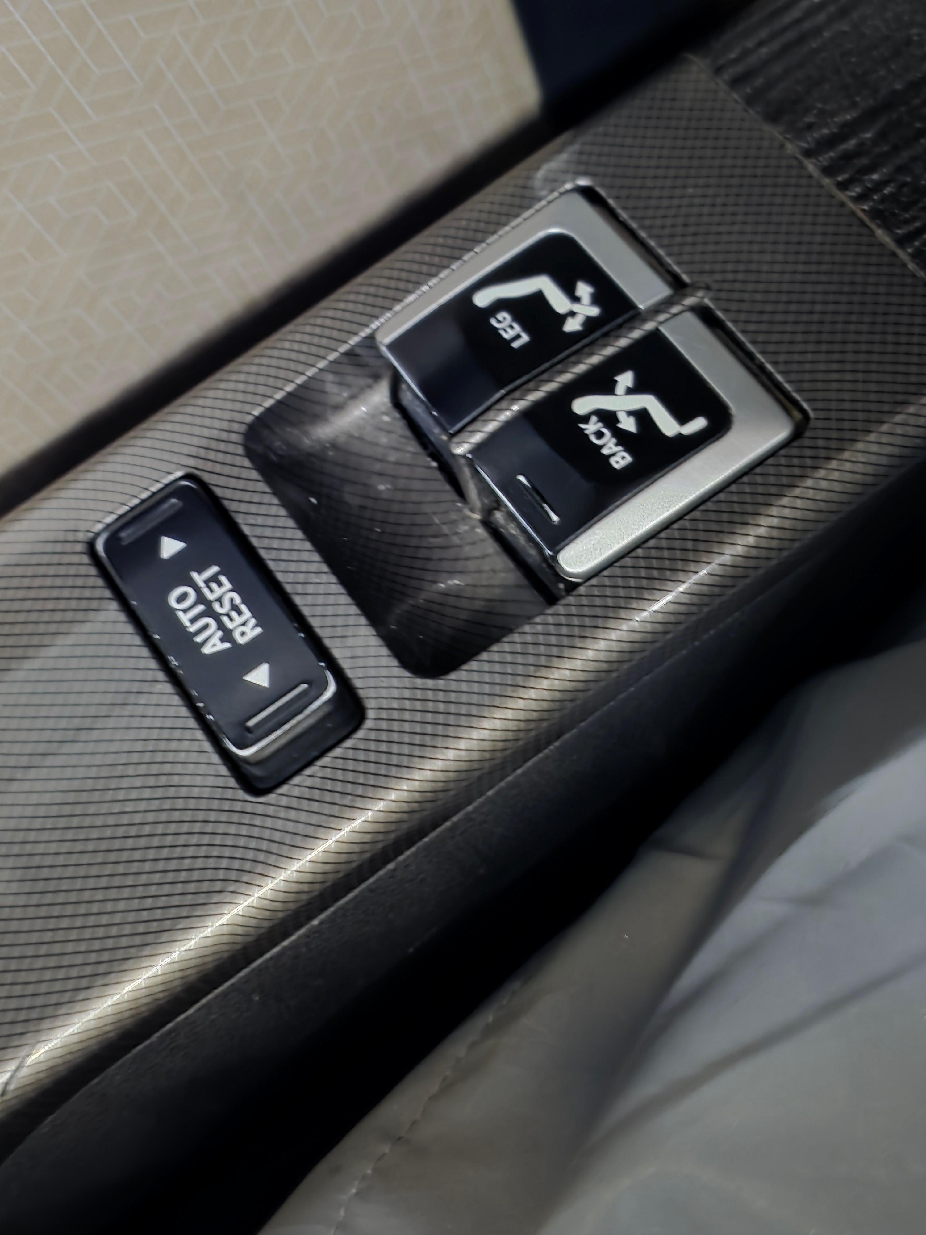오른쪽 팔걸이엔 리클라이너 기능 버튼들이 있습니다. 좌석을 뒤로 기울이는 버튼과 다리 받침대 버튼이 있습니다.