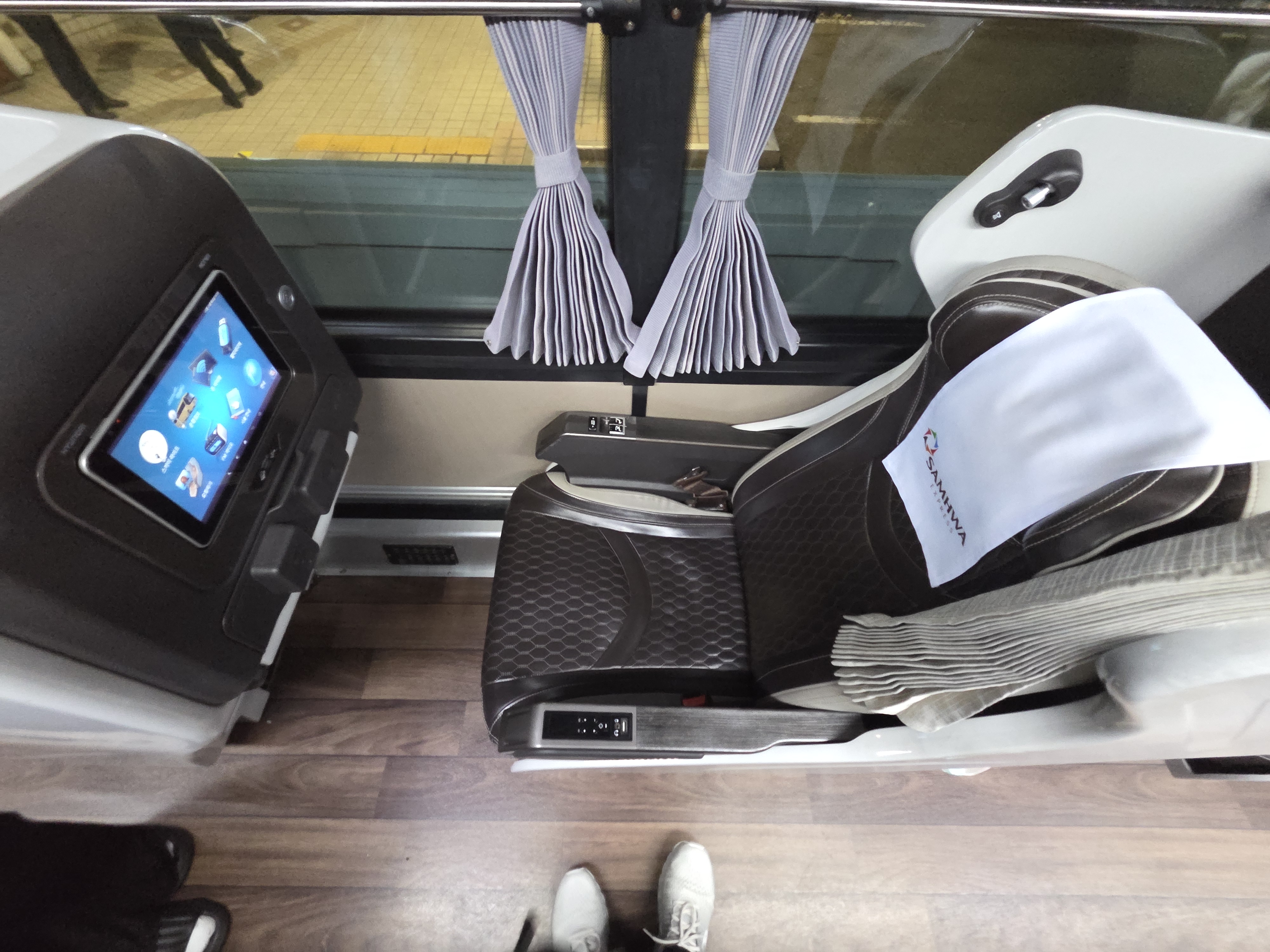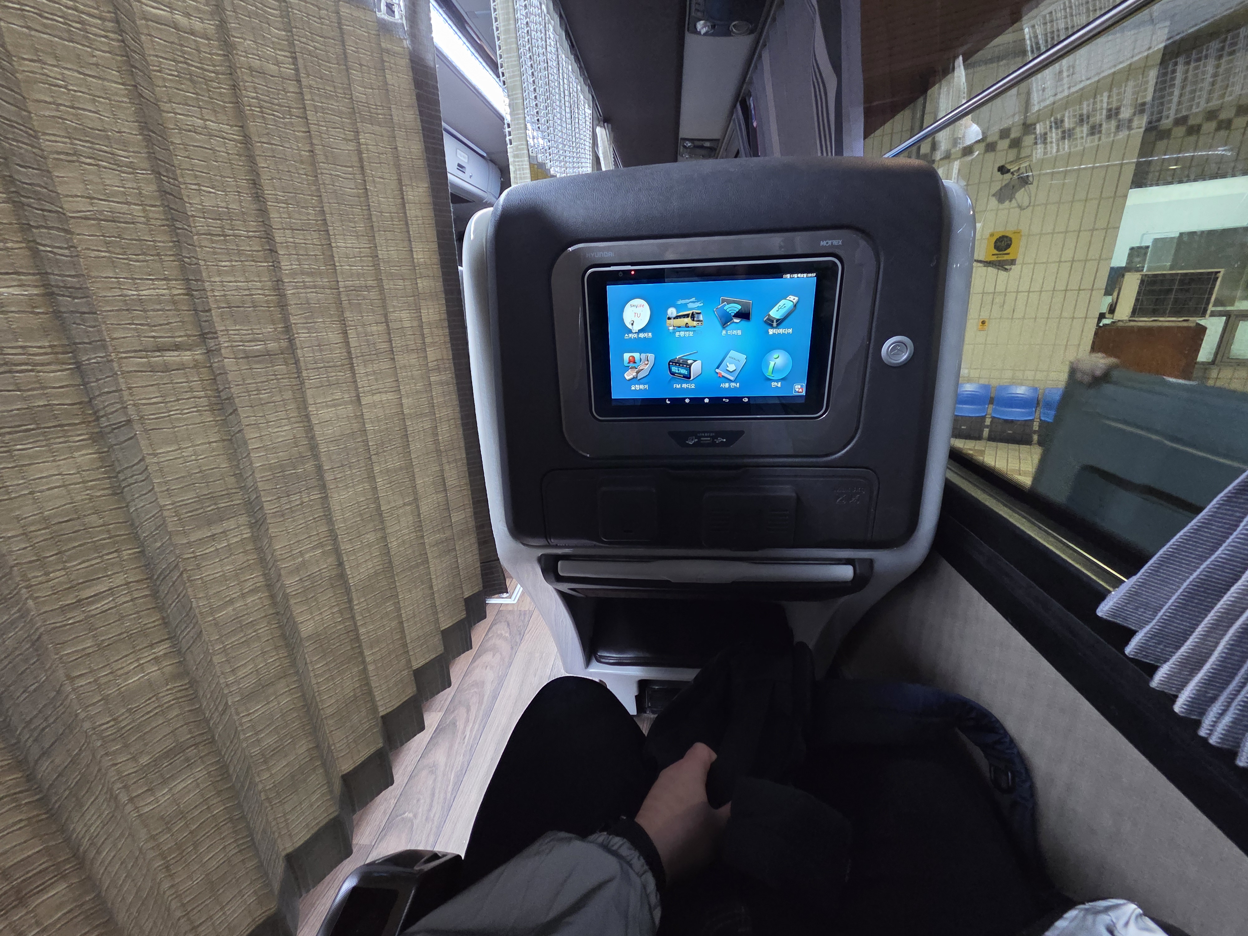 프리미엄 고속버스는 일단 커튼으로 다른 사람들이 볼 수 없게 시선이 차단이 되기 때문에 프라이버시, 사생활 보호가 되어 입을 쫙 벌리면서 잠들어도 신경쓰지 않아도 되는 장점이 있지요. 그리고 앞에는 여러 엔터테인먼트 기능이 제공되는 터치스크린이 있습니다. 예전엔 TV가 나왔었는데 이번에 탑승한 차량의 경우 연식이 좀 오래 된 느낌이 들었습니다. TV가 수신카드를 확인해달라는 문구만 뜨면서 나오질 않았습니다.