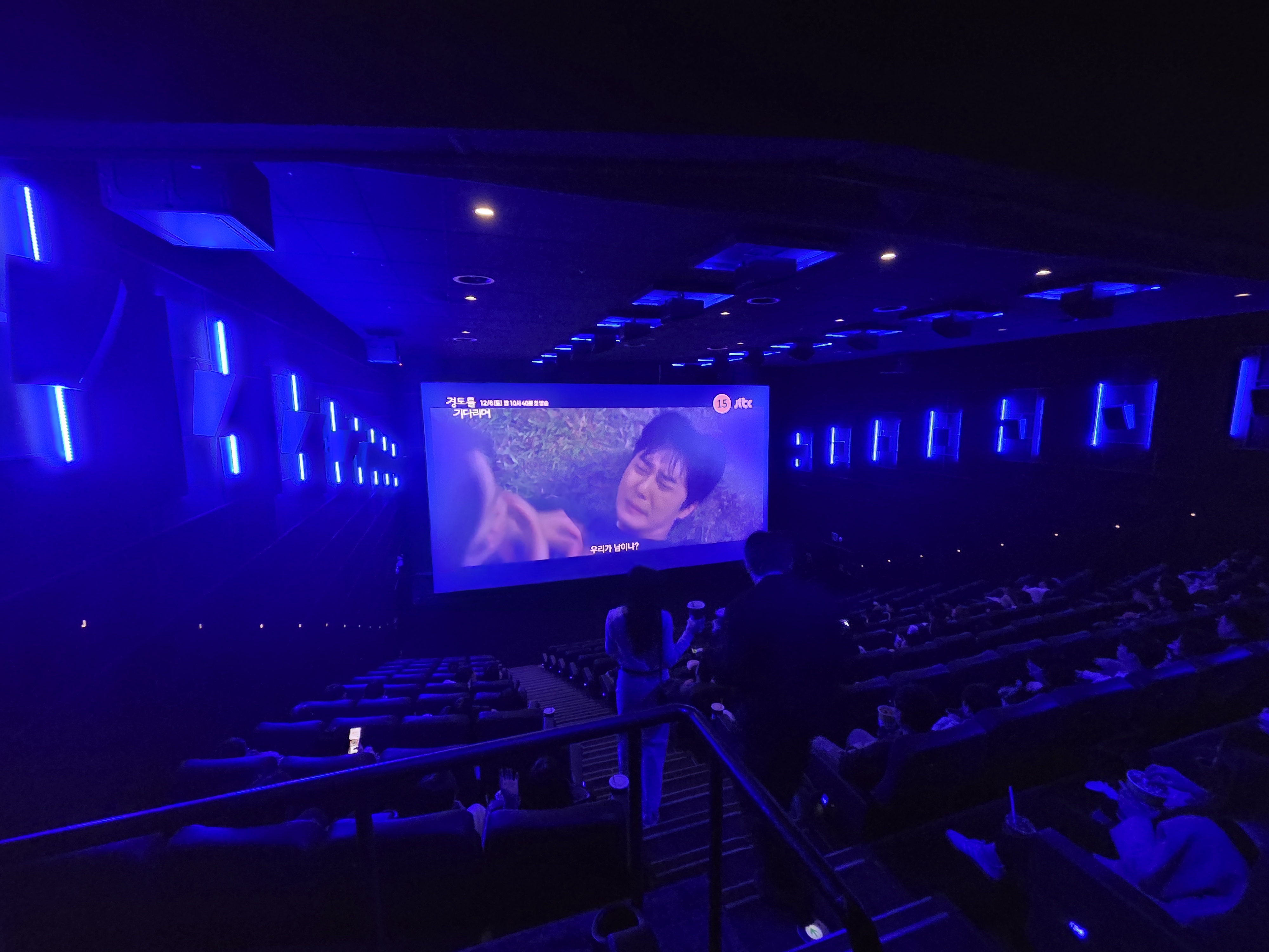 문제가 있다면 보통은 의자 등받이를 흔들면 1~2좌석 정도로만 흔들릴텐데 이 곳의 의자는 거의 4~5개의 좌석이 같이 흔들립니다. 과장 좀 보태면 실수로 앞좌석을 발로 차면 그 좌석 사람뿐만 아니라 거의 앞줄의 절반 가까이의 사람들이 흔들림을 느낄 수 있겠다는 생각이 들 정도였습니다.영사 품질은 괜찮은 편이었습니다. 듀얼 레이저 모듈 영사기를 쓰는 돌비시네마와 비교한다면 싱글 모듈이라 그런지 아주 미세하게 색감이 약하고 살짝 선명함이 약한 느낌이 드는 정도 외엔 거의 화질적인 면에서는 차이가 없다고 할 수 있겠습니다.